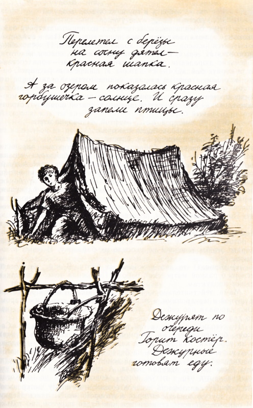 Юля стала на себя не похожа и сама не понимает, что с ней такое. Конечно, она любит маму, папу. Каждый человек любит своих родителей. Юля всегда считала, что ее любовь к родителям — это ее личное дело, говорить об этом не принято и демонстрировать эту любовь совсем не обязательно. Родители и так знают, что их дочь Юлька их любит. Почему же теперь, в этом походе, едва появляется Женя, Юлька как ненормальная кидается на шею своему отцу и целует его? Что она, ошалела? И при чем здесь отец? Он смущенно бормочет: — Ну, Юлечка, маленький, довольно. Ласковый какой человек, оказывается. Юля, не видя, не глядя, всегда знает, где в эту минуту находится Женя. Женя — взрослый парень, кумир, красавец с гитарой, лучше всех. И почему-то так важно, чтобы он не знал, как она любит его. Да, любит, любит, и от нее это совершенно не зависит. Десять лет. Мало? Так считается. А только любовь может быть настоящей, переворачивающей душу, и в десять лет. Это не Юля тянется за Женей, его лицом, немного широким. Его походкой, гитарой, улыбкой, веснушками на его щеках. За всем, что есть он, Женя. Не Юля, а что-то в ней, чему и названия нет, и это саму ее смущает, пугает. Эмоции не удержать в десять лет, нет опыта, нет силы, выдержки. И она направляет их в другую сторону — на отца. А отец не понимает, конечно. И не поймет никогда. И сама Юля не понимает. Однажды Андрей и Женя предложили: — Адмирал, давайте установим детские дежурства. Пусть будут дни, когда ребята все делают сами. Почему мы всегда только на подхвате? Адмирал перестал выстругивать ореховую свистульку для девчонок, почесал в затылке черенком ножа: — А в самом деле — почему вы должны быть только на подхвате? Я не возражаю — дежурьте. Но помните: это трудно. — Знаем, знаем… — Андрей и Женя совсем несолидно поскакали за малиновые заросли. Там их ждали Юлька и Вика. Там же сидел Алеша и, не теряя времени попусту, ел малину прямо с куста. — Согласился? — Вика сверкнула зеленым длинным глазом. — Конечно, — солидно кивнул Андрей. — Предложение дельное, чего же Адмиралу спорить? Решили разделиться на две бригады. Нет смысла всем одновременно толкаться у костра. — Мы будем друг другу только мешать, — сказал Андрей, — две бригады — это правильно. Женя молчал. Юля напряженно ждала, что скажет Женя. Ей казалось, она только и делала, что ждала: что скажет Женя, как он поступит, кому из них даст свою куртку погреться. И завидовала Вике — той все было безразлично. — Давай; Андрей, так: ты с девочками, а я с Алешкой подежурю. — Согласен, — ответил Андрей. Алеша просиял и протянул Жене ладонь, на которой лежала слегка придавленная малина. — На, Женя. Я себе еще найду. Юля вздохнула. Конечно, ей хотелось дежурить с Женей. А он предпочел Алешку. Какой толк в дежурстве от малыша Алешки? Хорошо, хоть не Вику выбрал. Алешка носился кругами, как счастливый щенок. — Женя! Я умею картошку чистить! Не веришь? Правда! Умею сосиски варить и пельмени. — Ну откуда в походе сосиски? — Юля не сдержала досаду. — Откуда в походе сосиски? Глупый ты, Алешка! Да еще пельмени! — Ну и что? Зато я умею воду кипятить! Андрей спросил: — Женя, может быть, кого-нибудь из девочек возьмете себе в помощь? Неравные у нас силы-то. Юля почувствовала в лице жар, как от костра. Может, выберет ее? Почему бы нет? И она будет варить с ним кашу. Заваривать чай. Сыпать в котел вермишель. Мыть миски. Неважно, чт