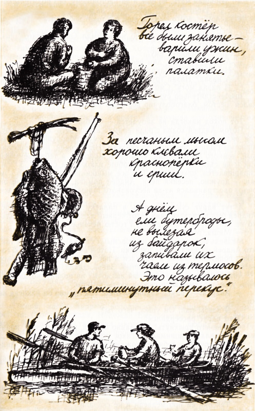 Несколько вечеров «молодежь» отсыпалась. Утром ребята самолюбиво поднимались очень рано, как все. И шли на веслах наравне со взрослыми. Но вечером они сваливались спать, когда было совсем светло, пели в лесу птицы, плавали Адмирал и Капитан, Жадюга варила варенье из дикой смородины. Алешина мама, Инна, вязала розовый свитер, тетя Марина, уютно подобрав ноги, сидела с ней рядом. Тете Марине давно хотелось научиться вязать, но пока у нее не получалось. Она смеялась: