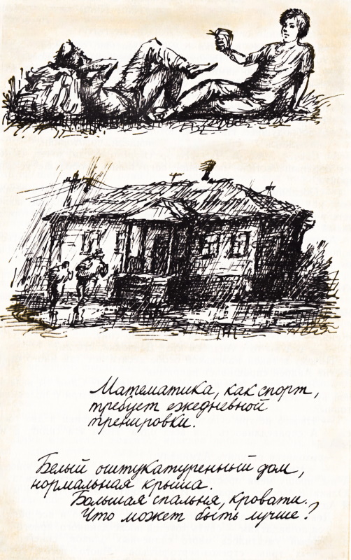 В Москве Андрей и Женя каждый день занимаются математикой, каждый сам по себе. Они охотно занимались бы вместе. Главное — похоже: и у Жени, и у Андрея математике отдано все свободное время. Они выискивают сложные задачи в разных задачниках для абитуриентов, в журнале «Квант». Но заниматься вдвоем они не могут — слишком разные характеры у них, разные условия каждому нужны для занятий. Андрей сначала убирает со стола, вытирает пыль. Ему надо, чтобы перед глазами не было ничего, кроме условия задачи. И вот горит настольная лампа, перед Андреем толстая стопка бумаги. Пиши и не думай, что бумаги не хватит, что ручка куда- то закатится — две запасные приготовлены в ящике. Андрей плотно закрывает дверь своей комнаты, чтобы чувствовать полную свою отдельность от всех. Ему надо, чтобы не только не входили к нему в это время, но чтобы даже и думать об этом было не нужно. Никто и не может войти. Человек занимается важным делом. Женя решает задачи везде. Ему даже не обязательно все время видеть условие задачи — достаточно раз прочитать. Женя может сидеть на английском, а в это время в его голове «варится» решение задачи. Может танцевать, а оно «варится». И в футбол может играть вполне азартно, а потом, вытерев мокрый лоб, скажет: — Решил, честное слово. Смотри, Андрей. У Жени потрясающая память. Он даже стесняется ее немного — неловко быть необыкновенным. И он говорит: «У меня голова как помойка, в ней все без разбора». Иногда Женя решает задачу на каком-нибудь уроке. Не на каждом же уроке надо так уж внимательно слушать учителя. В девятом классе это все знают. Но одни, зная эту истину, играют в «морской бой», другие читают детектив, третьи отключаются еще как-то. Женя решает задачи. И в автобусе решает, и в метро. А потом переносит свои записи с клочков, исчерканных в метро, в толстую тетрадь. По ходу дела еще оценивает, насколько та или иная мысль достойна быть записанной в толстую тетрадь. Женя сказал Андрею однажды: — Я задумался — и уже один. Мне уединяться не надо. Но по четвергам Женя приходит к Андрею. Раз в неделю они занимаются математикой вместе. К этому дню Андрей отыскивает самые трудные задачи, которые они с удовольствием разбирают вдвоем. И еще в этот день они показывают друг другу все, что успели сделать за неделю. Гордятся взятыми интегралами, иногда спорят, иногда хвалятся. Иногда они пытаются решать мировые проблемы. Весной, например, Андрею показалось, что он вот-вот докажет теорему Ферма, которую до сих пор никто доказать не сумел, хотя пытались многие. — Понимаешь, Женя, — он дрожал от предчувствия великого открытия, — на полях рукописи Ферма написано, что доказательство очень простое. А во всех книгах эту теорему пытаются доказать сложными способами. Ну а я пробую простым. — А если Ферма пошутил? Или написал на полях не про эту теорему? — Ну да! Он написал на этой рукописи, а не на другой! — И что? Подумал про что-нибудь другое и записал, чтобы не забыть. Разве так не делают люди? — Делают. Но вдруг я решу? А, Женя? Новая ступень в математике! — Пробуй. Андрею было хорошо оттого, что Женя и не думал над ним насмехаться. Он понимал, его друг Женя, что великие задачи решаемы в принципе. А тогда почему бы их не решать таким людям, как Андрей? Женя в эту весну пытался решить проблему четырех красок. Андрей про нее впервые услышал от Жени. Женя подолгу просиж