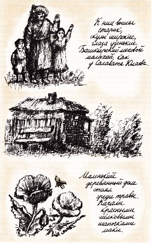 По берегам расстилались луга, широкие, ярко-зеленые. Вечером там паслись лошади, табун стоял у реки, на фоне заката небольшие точеные лошадки казались черными, развевались хвосты на ветру. Мчался всадник. Пригляделся Андрей — а это мальчишка. Может, лет двенадцати. А может, и десяти. Мальчишка сидел верхом, обхватив лошадь босыми ногами. И она несла его, летела, и грива летела. Тишина в лугах, только копыта стучат по земле. — Кумысные лошадки, — сказал отец. — Здесь, в этих краях, делают целебный напиток — кумыс. Из кобыльего молока. — Вкусный? — спросил Андрей. — А мы его попробуем. Завтра сходим и попросим бутылку или две. Лошади вошли в воду, нагнули длинные шеи, аккуратно пили. Отражения в розовой воде были тоже черными. Потом они напились, вышли из реки. Мальчишка крикнул что-то высоким голосом, и табун помчался, полетел. Целый табун — и один мальчик. Это было так необыкновенно, что окликнуть мальчика Андрей не посмел бы. Как будто все это — огромный волшебный театр. Мальчик и красавицы лошади — на сцене, а Андрей — зритель, он может только восхищаться. Обращаться к этим волшебным картинам он не может ни с какими словами. Утром отец тихо сказал около их палатки: — Андрей, Женя, пошли пить кумыс. На тропе их ждали Адмирал и Юлька с Викой. Остальные спали. — А вы-то чего, девчонки? Ты же, Юля, никакого молока не пьешь — ни коровьего, ни козьего, — сказал заспанный Женя. Он, похоже, был не рад, что согласился с вечера идти за кумысом. Спать хотелось. — А кумыс — не молоко. Я хочу попробовать. — Юля шагала по тропинке, роса сверкала разноцветными огоньками, пахло медом и хвоей. Вика тоже сказала: — Кумыс для всех, а не только для больших. Это же не вино, правда, Юля? Маленький деревянный дом стоял среди травы. Качали красными шелковыми шапочками маки. К ним вышел старик, скулы широкие, глаза узенькие. Башкирский меховой малахай как у Салавата Юлаева. — Здравствуй, здравствуй. — Старик разговаривал только с Адмиралом. Он сразу определил в нем главного. — Хотим кумыс попробовать, никогда не пили. Можно купить кумыс? — Угостить могу, зачем продавать? Здесь не магазин, не базар. Садись. — Старик указал на скамейку, вкопанную у забора. Они сели рядышком, молча ждали, смотрели вокруг. Андрей любит лес — среди деревьев ему спокойно, как в доме. И шум вершин кажется похожим на музыку. Но своя красота есть и в лугах. Пространство, открытое глазам, откровенность какая-то. Травы шелково гнулись, яркие маки, тихие колокольчики, нежные малиновые гвоздички-часики. И все это было распределено среди зеленой травы, как будто трудился умный художник. А природа и есть великой художник. Кто-то дернул Андрея за рукав. Рядом стоял маленький мальчишка, улыбался, узкие глаза блестели хитростью и весельем: — Дай шесть конфет. Дай, Москва, шесть конфет. — Нет у меня. — Андрей развел руками. — Нет, понимаешь? Трехлетний человек развел руками: — Не понимаю. Дай шесть конфет. Тут из дома выбежала девочка лет семи, схватила малыша за руку, повела к дому: — Нашелся умный. Не слушайте его. Шесть конфет, главное, просит. Как будто он до шести умеет считать. — Она весело шлепнула малыша, сказала ему что-то по-башкирски. Он обернулся, тащился за ней, а сам смотрел на них и повторял нарочно: — Шесть конфет дай, ты, Москва. В кармане посмотри. Они исчезли за углом дома. — Во туземец настырный, — засмея