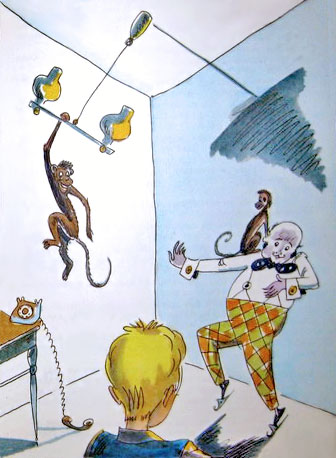 Вокруг Симеона Симеоновича пышно колыхался густой дым. Все четыре обезьяны обняли его за шею, и казалось, что у Симеона Симеоновича пять голов. В руках он нес медвежонка, да еще подпихивал ногой большую медведицу, которая, переваливаясь, неуклюже спускалась по ступенькам.