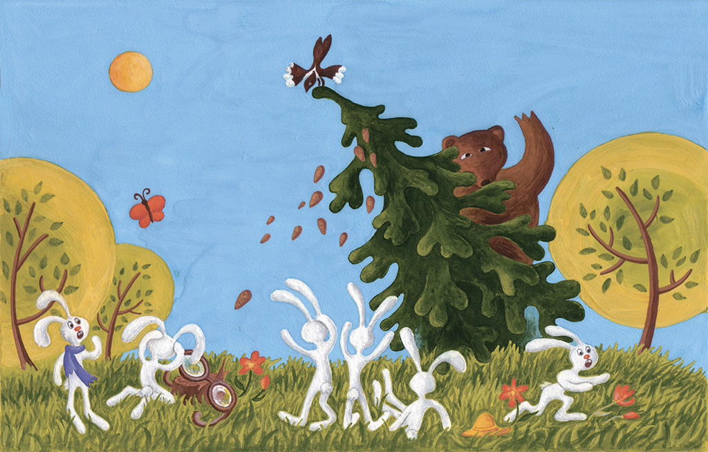 Потапыч приподнялся, поелозил лапами в траве и поднял из травы очки. – Вот же мои очки! – обрадовался он. – Ведь помню: положил на пень, а на какой пень… Ну и растяпа я. Любовно протерев стёкла и водрузив очки на нос, Потапыч огляделся и сказал: – Удивительно – никого. А ведь своими ушами слышал, как меня звали. Мишку, Мишку… – и, почесав вздувшуюся на лбу шишку, добавил: – Всю жизнь в лесу, а стоит потерять очки, и на тебе – башкой в ёлку… Ну куда это годится? Никуда это не годится… А тем временем зайцы бежали. Лидировал Кеша. Ему в затылок взволнованно дышал шепелявый Людвиг. – Ты фто наделал?! – кричал Кеше Людвиг. – Тебя кто просил Потапыча зафыбать?! Тебя просили ма-а-аленькую фыфечку срезать! Фто теперь будет?! – Фыфечку, фыфечку! – едва не плача, кричал ему шепеляво в ответ Кеша. – Кто тебя просил не верить?!
