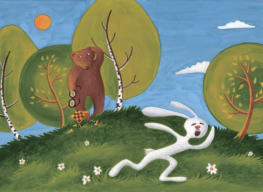 Потапыч лежит, положив свою большую голову на лапу, и передвигает фигуры нежно. Клюквонька, напротив, бродит по поляне, лишь изредка останавливаясь около доски. И фигуры заяц двигает стремительно, словно боится не успеть. Клюквонька закладывает руки за спину, хватается за голову, переплетает пальцы и так громко трещит ими, что один задремавший дятел выронил шишку… – Ну что вы мне тычете сюда пешку, – бормочет Клюквонька. – Совсем даже напрасно вы её сюда ставите. Разве вам, Потапыч, не ясно, что я её сейчас ладьёй, а потом так, а потом сюда и… вам мат в три хода. Матюльничек классический. – Как бы не так… – Вы рискуете, сударь. Ой, рискуете, – шепчет Клюквонька, двигает фигуру, убегает на край поляны и кричит оттуда: – А вам шах, разлюбезный вы мой! – А я сюда… – не торопясь переставляет фигуру Потапыч. – Ха-ха, сказала жадная блоха! – произносит загадочную фразу заяц, хватается за голову, мычит, теребит уши и, наконец, двигает фигуру и уносится на край поляны. – Бац! И нету вашей турочки! – И Потапыч снимает с доски фигуру. – Стой! Как?! Почему?! – подлетает к доске Клюквонька. – Где стояла? А эта где стояла? – Клюквонька, не веря своим глазам, переводит растерянный взгляд с Потапыча на доску и обратно. – Нечего зевать, – улыбается медведь. – Помнится, вчера вы мне лекцию прочли о вреде невнимательности. – Как же это? – трагически шепчет раздосадованный Клюквонька и с удесятерённой сосредоточенностью впивается взглядом в доску. – Я же помню, ещё так и подумал: срочно, Клюквище, убирай отсюда туру, а то этот… этот медведь её о-бя-за-тель-но слямзит. Ну ничего, ничего, ничего… К счастью, Абу знал секреты индийских йогов, – вновь произносит загадочную фразу Клюквонька, передвигает фигуру и неуверенно, спиной вперёд и не отводя глаз от доски, бредёт к краю поляны. – Ой! Вам… мат, – Потапыч испуганно смотрит на доску. – Что?! – Клюквонька бросается к месту трагедии. – Может… может, я неправильно сходил? – шепчет испуганно Потапыч. – Правильно, – страдальчески морщится Клюквонька. – Всё правильно. Бей щелбан. – Может, как-то… – тянет медведь. – Что, выиграл, ещё и издеваешься? Да? Потапыч осторожно коснулся пальцем заячьей головы – Клюквонька кубарем полетел в траву. – Ага! – вскакивая, закричал Клюквонька. – Так вот ты как! Вот как с тобой играть! Я ему щелбанюньчик, а он! А он мне – щелбанище! – И Клюквонька бросился прочь с поляны… – Эх, надо же так опростоволоситься… – бормочет Потапыч, собирая фигуры. – С кем теперь играть в шахматы? Никто же не умеет. Надо ж было так нечаянно выиграть! Эх! Собрав шахматы, медведь уходит, и становится тихо. Лишь кукушка кукует. Придётся теперь считать её куки. Примета такая: сколько куков насчитаешь, столько и жить… Раз, два, три, четыре… пятнадцать, шестнадцать… сорок восемь… семьдесят девять… триста четырнадцать… Тьфу! Не знаю, как у вас, а у нас кукушки очень человеколюбивые. Поэтому я этот свой рассказ о Клюквоньке и Потапыче заканчиваю, а вы, если желаете свой век в точности знать, считайте себе на здоровье дальше кукушкины куки…