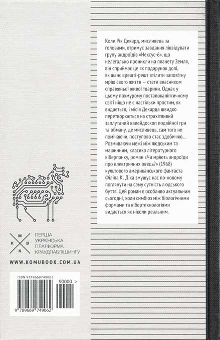 Бадьоре електричне дзижчання в адаптері настрою, який стояв біля ліжка, розбудило Ріка Декарда легко і невимушено. Здивований, а його завжди дивувало пробудження без найменших проміжних відчуттів, він підвівся на ліжку і потягнувся у строкатій піжамі. У цю ж мить у своєму ліжку розплющила невеселі сірі очі його дружина Айрен, кліпнула, застогнала і знову їх заплющила. — Ти дуже слабко налаштовуєш «Пенфілд», — сказав він дружині.— Я підрегулюю, і ти прокинешся... — Не чіпай мого регулятора, — в її голосі вчувалася безрадісна роздратованість. — Мені не потрібно прокидатися. Рік сів біля дружини, схилився над нею і спокійно пояснив: — Якщо налаштуєш на коливання вищої амплітуди, то прокинешся у чудовому гуморі; от і все. Постав на «С» і долатимеш поріг гальмування свідомості так само, як я. Дуже доброзичливо Рік погладив оголені бліді плечі дружини; його власний регулятор стояв на рівні «D», а це означало, що на світ він дивився добродушними очима. — Забери геть свої руки, копе, — промовила Айрен. — Я не коп... — тепер уже він відчув роздратування, хоча нічого не змінював у налаштуванні. — Навіть гірший за копа, — відповіла йому дружина, не розплющуючи очей. — Ти — вбивця, найнятий копами. — За своє життя я не вбив жодної людини, — його дратівливість зростала; переростала майже у відверту ворожість. — Лишень бідолашних анді, — сказала Айрен. — Але, здається, тобі це не завадило розтринькати мої преміальні, — Рік підвівся з ліжка і підійшов до адаптера настрою. — Замість того, щоб заощадити грошей, — говорив він, — купити справжню вівцю і не ходити до тієї електричної на даху. До тієї нещасної електричної тварини; а я заробляю непогано, і то вже немало років! Він стояв нерішучо перед корпусом адаптера настрою, розмірковуючи, чи варто йому набрати код таламічного депресанту (щоб позбутися гніву), чи таламічного стимулятора (щоб розпалитися і взяти гору в суперечці). — Якщо набереш код більшої злості, — сказала Айрен, розплющивши очі й пильно дивлячись на нього, — то я і собі наберу. Наберу навіть код максимальної люті та влаштую тобі такий скандал, що всі ті наші сварки здадуться тобі дитячою забавою. Набирай. Тільки спробуй і побачиш. Вона зіскочила з ліжка, підбігла до корпусу свого адаптера настрою; стояла нерухомо, дивилася сердито, вичікувала. Рік зітхнув, переможений її погрозою. — Наберу код за своїм графіком на сьогодні, — перевіривши свій графік на з січня 1992 року, він побачив, що у нього має бути день ділового та професійного ставлення до роботи. — Якщо я наберу код згідно з графіком, — обережно спитав Рік, — ти зробиш так само? Чекав, нічого не обіцяючи, аж поки дружина не пристала на його пропозицію. — Мій графік на сьогодні — шестигодинна депресія з елементами самозвинувачування, — сказала Айрен. — Що? Що це в біса за графік? — такий підхід суперечив самій меті застосування адаптера настрою. — Ніколи б не подумав, що тобі саме цього заманеться, — сказав він похмуро. — Одного вечора сиділа я тут, — розповідала Айрен, — і, зрозуміло, ввімкнула Бастера Френдлі та його друзів, а він саме заходився інтригувати якимсь дуже важливим викриттям, котрим збирався всіх нас ошелешити... і тут у передачу вклинили рекламу, ну, оту, найбільш ненависну для мене... свинцеві гульфіки фірми «Маунтібенк»! Я на секунду вимкнула звук... І почула... ти знаєш, 