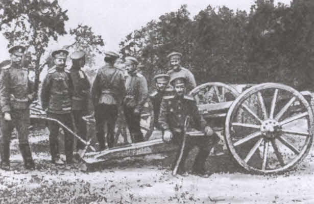 Офицеры русской армии у захваченной в Каушенском бою немецкой пушки. Август 1914 г.