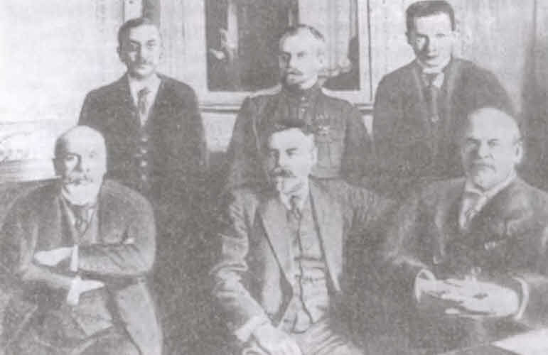 Члены исполнительного комитета Государственной думы. Крайние справа: М. В. Родзянко и А. Ф. Керенский