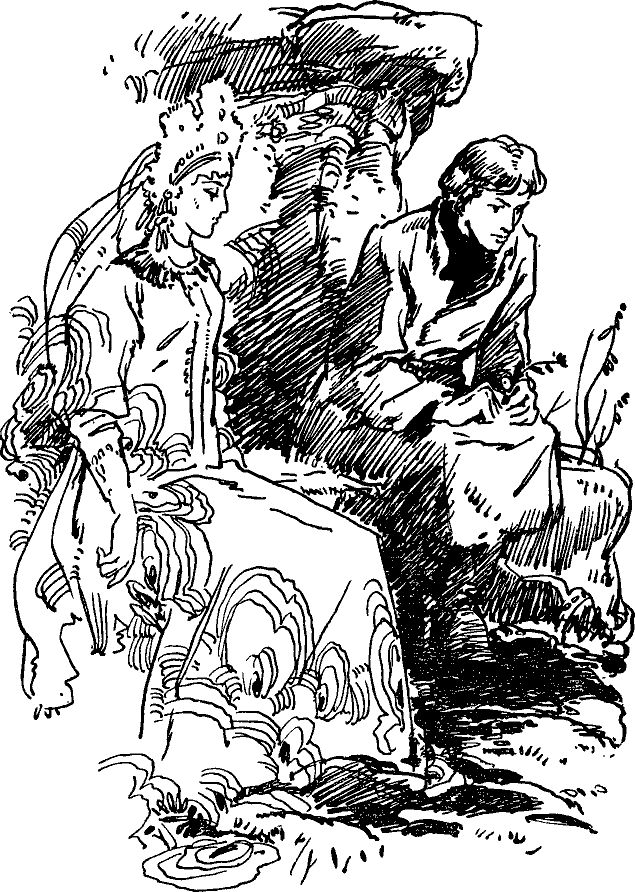 — Не вышла, — отвечает. — А ты не вешай голову-то! Другое попытай. Камень тебе будет, по твоим мыслям. — Нет, — отвечает, — не могу больше. Измаялся весь, не выходит. Покажи каменный цветок. — Показать-то, — говорит, — просто, да потом жалеть будешь. — Не отпустишь из горы? — Зачем не отпущу! Дорога открыта, да только ко мне же ворочаются. — Покажи, сделай милость! Она ещё его уговаривала: — Может, ещё попытаешь сам добиться! — Про Прокопьича тоже помянула: — Он-де тебя пожалел, теперь твой черёд его пожалеть. — Про невесту напомнила: — Души в тебе девка не чает, а ты на сторону глядишь. — Знаю я, — кричит Данилушко, — а только без цветка мне жизни нет. Покажи! — Когда так, — говорит, — пойдём, Данило-мастер, в мой сад. Сказала и поднялась. Тут и зашумело что-то, как осыпь земляная. Глядит Данилушко, а стен никаких нет. Деревья стоят высоченные, только не такие, как в наших лесах, а каменные. Которые мраморные, которые из змеевика-камня… Ну, всякие… Только живые, с сучьями, с листочками. От ветру-то покачиваются и голк[5] дают, как галечками кто подбрасывает. Понизу трава, тоже каменная. Лазоревая, красная… разная… Солнышка не видно, а светло, как перед закатом. Промеж деревьев змейки золотенькие трепыхаются, как пляшут. От них и свет идёт. И вот подвела та девица Данилушку к большой полянке. Земля тут, как простая глина, а по ней кусты чёрные, как бархат. На кустах большие зелёные колокольцы малахитовы, и в каждом сурьмяная звёздочка. Огневые пчёлки над теми цветками сверкают, а звёздочки тонёхонько позванивают, ровно поют. — Ну, Данило-мастер, поглядел? — спрашивает Хозяйка. — Не найдёшь, — отвечает Данилушко, — камня, чтобы так-то сделать. — Кабы ты сам придумал, дала бы тебе такой камень, а теперь не могу. — Сказала и рукой махнула. Опять зашумело, и Данилушко на том же камне, в ямине-то этой оказался. Ветер так и свистит. Ну, известно, осень. Пришёл Данилушко домой, а в тот день как раз у невесты вечеринка была. Сначала Данилушко весёлым себя показывал — песни пел, плясал, а потом и затуманился. Невеста даже испугалась: — Что с тобой? Ровно на похоронах ты! А он и говорит: — Голову разломило. В глазах чёрное с зелёным да красным. Света не вижу. На этом вечеринка и кончилась. По обряду невеста с подружками провожать жениха пошла. А много ли дороги, коли через дом либо через два жили. Вот Катенька и говорит: — Пойдёмте, девушки, кругом. По нашей улице до конца дойдём, а по Еланской воротимся. Про себя думает: «Пообдует Данилушку ветром, — не лучше ли ему станет». А подружкам что… Рады-радёхоньки. — И то, — кричат, — проводить надо. Шибко он близко живёт — провожальную песню ему по-доброму вовсе не певали. Ночь-то тихая была, и снежок падал. Самое для разгулки время. Вот они и пошли. Жених с невестой попереду, а подружки невестины с холостяжником, который на вечеринке был, поотстали маленько. Завели девки эту песню провожальную. А она протяжно да жалобно поётся, чисто по покойнику. Катенька видит — вовсе ни к чему это: «И без того Данилушко у меня невесёлый, а они ещё такое причитанье петь придумали». Старается отвести Данилушку на другие думки. Он разговорился было, да только скоро опять запечалился. Подружки Катенькины тем временем провожальную кончили, за весёлые принялись. Смех у них да беготня, а Данилушко идёт, голову повесил. Сколь Катенька ни старается, не може
