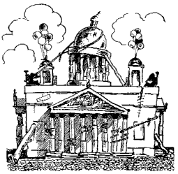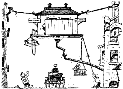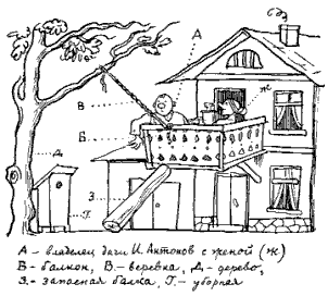 4. Но что это? Какое чудо случилось в наши реальные дни? Андрюша наперекор стихии объясняет публике теорию своего падения. Он говорит, указывая на газету: «Большинство наших домов мало заботится о чистоте. На дворах и лестницах непроходимая грязь, пыль и мусор». Так что на таком дворе не токмо с 3-го, а и с 6-го этажа можно смело сигать, как на перину.
