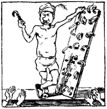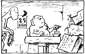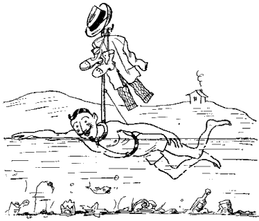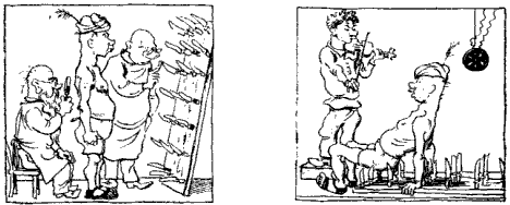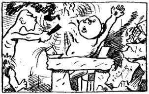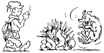 Всем известны индийские йоги и факиры, которые имеют привычку показывать разные затруднительные опыты. Эти факиры глотают огонь почем зря, ложатся на гвозди, подбрасывают канат в воздух и влезают туда на самую верхотуру. Однако теперь эти факиры нам больше не нужны. Отныне импорт этих заграничных шпагоглотателей может быть прекращен. Наш талантливый маэстро Госфикус делает все, что делают йоги и факиры, и еще от себя кое-что добавляет. Сегодня Андрэ Госфикус будет показывать выдающийся фокус, достойный общественной грусти и сожаления. 1. Андрэ, полный решимости, стоит раздевшись и разувшись и дает науке возможность выслушать свои внутренние объективные признаки. Сбоку стоит обыкновенная доска, утыканная обыкновенными ножами.