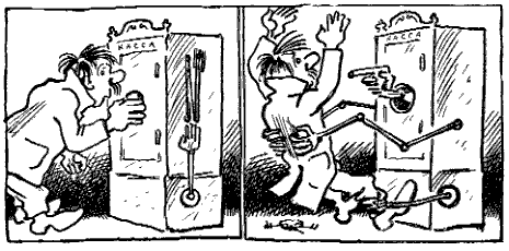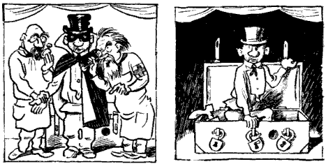 4. Мекеке, рекеке, собака. Вуаль, вуаля! Человеку не страшны запоры! Андрюша вышел из сундука и стоит теперича перед публикой и под гром оваций дает научное разъяснение. Нету загадок и нету тайн природы. Все имеет себе объяснение. Сундук был закрыт на 3 замка, изготовленные в Туле. Замочки вполне дозволяют производить подобные иллюзионные акты. Гип, гип, ура!