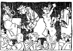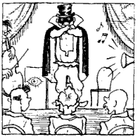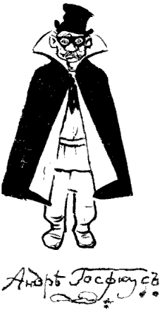 Сегодня Андрэ Госфикус покажет новые чудеса природы — гипноз многих зрителей на расстоянии. Многие медики и шарлатаны также пользуются этим могучим средством для выкачивания денег из кармана трудящихся граждан, в то время как Андрэ Госфикус за те же деньги покажет научный фокус, имея целью разъяснить, что нет больше тайн природы, а есть голые факты, взятые из газет. 1. Андрюша Госфикус в своем оригинальном наряде выходит до публики со скрещенными ручками и делает поклон, как бы извиняясь за свой скромный вид и за те дела, которые происходят в Ленинграде и окрестностях.