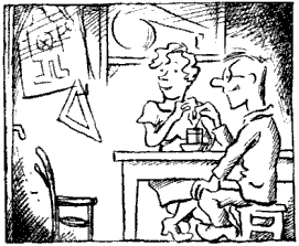 Энергичный общедоступный характер Андрэ Васильевича не дозволяет ему отдавать свое творчество только платной публике. Андрюша часто выступает безвозмездно в своем жакте, надеясь, что ему скинут квартплату. Но особенно любит он вузовскую молодежь. «Вот именно эти насквозь меня понимают», — не раз говорил Андрэ Васильевич. 1. Приглашенный однажды на вечеринку Андрэ Васильевич решил блеснуть полной силой своего дарования. — Вот тут на доске, — сказал Андрюша, — я начертил в научном смысле часы и ступку. Сейчас я у кого-нибудь возьму часы, растолчу их в ступке, покрою все обыкновенным носовым платком...