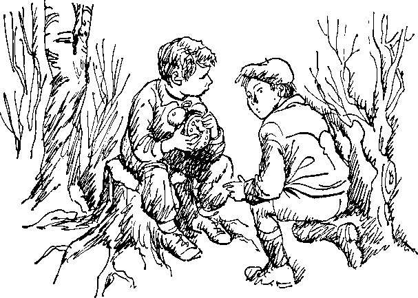 Лойзик обмывал рану в ручье и мычал от боли: уж очень щипало… Кожа на колене была здорово содрана. — Скоро пройдет, — утешал его Франтик. Он сидел на траве и рассматривал будильник. — Франтик, у тебя есть носовой платок? — Есть, только грязный. Пусть коленка подсохнет на солнышке — так будет лучше. А когда придешь домой, намажь йодом. Есть у вас дома йод? — Есть… Только опять будет щипать. Йод ужасно щиплет. — К тому времени ссадина засохнет. Йод сильно щиплет, когда свежая рана. Вдруг Франтик вскочил: — Слышишь? Послушай! Лойзик схватил будильник, который лежал на траве около пня, и спрятал его под куртку. — А что там? — Слышишь? Кукушка кукует. — А я-то испугался, думал, кто идет. Ты не мог бы говорить поспокойней? — А откуда я знал, что ты испугаешься? Я в этом году еще ни разу кукушку не слышал… — Знаешь, у меня из головы не выходит та… ну, которая шла по улице… пани Маркова. Если она тебя узнала… И еще… — Лойзик опять сел на пень, наклонился к Франтику и заговорил шепотом: — Франтик, а ведь в комнате спал пан Докоупил! — Ты что!.. Ты правду говоришь? И он видел тебя? — всполошился Франтик. — Думаю, не заметил, он, кажется, спал, но в тот момент, когда я его увидел, пошевелился и что-то пробурчал. Я так испугался, что вывалился из окна, как тюфяк. — А почему ты мне об этом сразу не сказал? — Я сначала не собирался тебе говорить, а теперь решил: лучше, чтобы и ты знал… — Ой, Лойзик! Что с нами будет! — А что? — Ведь ты точно не знаешь, видел он тебя или нет… — Если бы он меня видел, наверняка побежал бы за мной. Просто спросонок что-то пробормотал… Может, он до сих пор спит. — Представляю, как ты испугался! Я бы даже убежать не смог. Послушай, Лойзик, давай пойдем и вернем этот будильник. Вдруг с нами беда случится!.. — Я так и знал, что не надо тебе говорить… — Ты же знаешь, как мне хотелось иметь этот звонок, а теперь… Теперь не хочется… — Мне тоже… — нахмурился Лойзик. — Пойдем, Лойзик, вернем этот будильник, пока ничего не случилось… Ведь все-таки мы… ну, знаешь… — Спятил? Разве мы теперь можем идти к Докоупилу? Ведь он наверняка уже проснулся и обе пани пришли домой!.. — А когда мы его вернем? — Ну, скажем, завтра. Можем мы до завтра подождать?.. — Завтра вся улица будет знать, что пропал будильник… — Знаешь, что я подумал? Если они будут искать будильник, может, посмотрят за комодом, не упал ли он туда, а там найдут сверток! Они поймут, что это не случайно, что это им взамен будильника, может, даже обрадуются и никому ничего не скажут… Давай, Франтик, подождем до завтра, посмотрим, что они будут делать. А завтра увидим… Ну а если что не так, вернем будильник. Как-нибудь изловчимся… — Ты так думаешь? — Сегодня все равно мы его вернуть не можем. — А куда его девать? — Спрячем где-нибудь. Хотя бы в лесу. — В лесу? А если пойдет дождь — и он намокнет, заржавеет и испортится? Надо хорошенько подумать! — Глупости… Нужно спрятать так, чтобы не попал под дождь. — Ты слышишь, как он тикает? — Слышу… Громко тикает… — А если кто услышит, что он тикает, и догадается? — О чем догадается? — Ну, мы его здесь спрячем, кто-нибудь пойдет, услышит тиканье и найдет будильник. — Ты думаешь? — Нет, нельзя его здесь оставлять! — Ну и домой брать нельзя. Еще по дороге кого-нибудь встретишь. Он тут же спросит: «Что это у тебя тикает под курткой?» — Правда. А если его как-нибудь остановить? — Поп