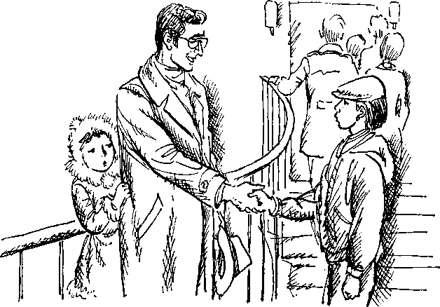 Трамвайный вагон был почти пуст. Кроме Тима, здесь сидел только кругленький, небольшого роста пожилой человек с веселым лицом, немного похожий на добродушного мопса. Он спросил мальчика, куда тот едет. — На вокзал, — ответил Тим. — Тогда тебе придется сделать пересадку. Этот трамвай не идет к вокзалу. Это я знаю точно: я и сам еду на вокзал. Тим держал свою фуражку на коленях и, ощупывая пальцами подкладку, слушал, как шуршит под его рукой сложенный вчетверо контракт. И вдруг ему пришло в голову, что теперь он должен стараться как можно чаще заключать самые невероятные пари. Может быть, какое-нибудь он и проиграет. Ведь тогда он вернет свой смех! И он сказал: — Держу пари, что этот трамвай идет к вокзалу! Кругленький человечек рассмеялся и сказал то же самое, что и кладбищенский сторож: — Ты проиграл пари, еще не успев его заключить! — И добавил: — Ведь это «девятый»! Он еще никогда не шел до вокзала. — И все-таки я держу с вами пари! — сказал Тим с такой уверенностью, что человек с удивлением замолчал. — Что-то уж чересчур ты в этом уверен, малыш. Так на что же мы будем спорить? — На билет до Гамбурга, — быстро ответил Тим. Он и сам был обескуражен своим поспешным ответом. Эта мысль так неожиданно пришла ему в голову. И все же она пришла не случайно. Ведь он давно уже решил отправиться в плавание. — А ты что, собираешься ехать в Гамбург? Тим кивнул. Приветливое лицо «мопса» расплылось в улыбке. — Тебе незачем спорить, малыш! Дело в том, что я тоже еду в Гамбург и взял два билета в двухместном купе. А тот господин, который должен был ехать со мной, задержался. Значит, ты можешь составить мне компанию. — И все-таки мне хотелось бы заключить с вами пари, — серьезно ответил Тим. — Хорошо! Давай поспорим. Но предупреждаю: ты проиграешь! А как тебя зовут? — Тим Талер. — Хорошее имя. Звучит, как звон монет[21]. А моя фамилия Рикерт. Они пожали друг другу руки. Так они одновременно и познакомились и заключили пари. Когда по вагону прошел кондуктор, господин Рикерт спросил его: — Скажите, пожалуйста, этот трамвай идет к вокзалу? Только кондуктор хотел ответить, как вагон качнуло, и он остановился. Тим чуть не упал на господина Рикерта. Кондуктор побежал на переднюю площадку. Как раз в эту минуту на нее вскочил чиновник управления городского транспорта с серебряными нашивками на кителе. Он взволнованно сообщил что-то кондуктору, тот взволнованно что-то ответил, потом вернулся в вагон и обратился к господину Рикерту: — Сегодня вагон в порядке исключения пойдет к вокзалу, потому что на нашей линии поврежден провод. Но обычно «девятый» не ходит по этому маршруту. Он приложил два пальца к козырьку фуражки и снова пошел на переднюю площадку. — Черт побери, ловко же ты выиграл спор, Тим Талер! — рассмеялся господин Рикерт. — Сознайся-ка, ведь ты наверняка слыхал, что на этой линии оборван провод. Ну, сознайся! Тим грустно покачал головой. Ему гораздо больше хотелось проиграть этот спор, чем выиграть. Теперь ему окончательно стало ясно, что господин Треч располагает возможностями, мягко выражаясь, необыкновенными. На вокзале господин Рикерт поинтересовался, где оставил Тим свой багаж. — Все, что мне нужно, со мной, — ответил Тим очень неопределенно и совсем не по-детски. — А паспорт у меня в кармане куртки. У Тима правда был при себе паспорт. Когда ему исполнилось четырнадцат