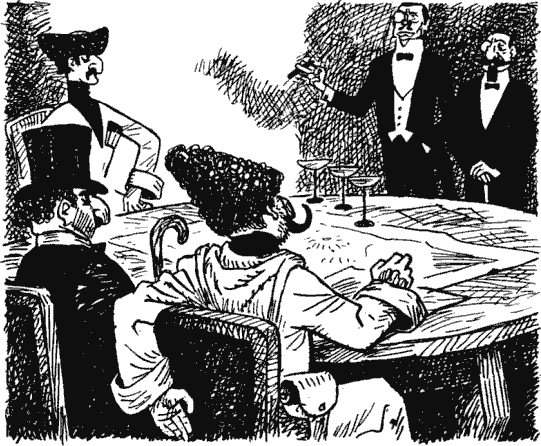 Это был самый обыкновенный «номер» гостиницы, хотя и оставленный почему-то без номера. Он был убран несравненно менее роскошно, нежели апартаменты Гогенлоэ. Но и здесь, как и там, шли вдоль стен зеркала, уставленные у подножий тропическими растениями. Их было три — по одному у каждой стены. Тингсмастер подошел к одному из них, вынул лупу и указал своим товарищам на два микроскопических «м» в уголке: — Эти зеркала — дело рук наших ребят с фотохимического и техника Сорроу. Смотрите-ка в оба глаза и учитесь, как с ними обращаться. Раз — Мик сдвинул зеркало вокруг своей оси, остановив его под прямым углом; два — Мик взял из-под стекла, прямехонько с цинковой пластинки, тончайшую пачку пленок; три — надвинул откуда-то сбоку новую пачку — и опустил зеркало на место. Потом они вышли из комнаты, заперли ее, и Тингсмастер прошел через стену к мисс Тоттер. Пачка пленок была опущена в банку с розовой жидкостью. Затем извлечена оттуда. Затем вставлена в маленький аппарат с фонариком на носу, похожий на пушку. Электричество потушили, нос аппарата засветился, на стене образовалось круглое пятно. — Учитесь, друзья, — сказал Тингсмастер, — не все еще в наших руках. Бывают случаи, когда мы бессильны проникнуть к врагу. Нам не удалось нынче услышать, о чем они там между собой сговаривались, но зато мы можем увидеть их. Зеркальный аппарат Сорроу устроен так, что при повороте выключателя три зеркала передают все, вокруг совершающееся, в поле фотографической камеры. Тотчас же начинается бесшумная съемка — и вот извольте посмотреть. Он завертел ручкой машины, и на освещенном экране появилось изображение только что покинутой ими комнаты. Она не была пуста. В ней двигались, рассаживаясь вокруг стола, четверо мужчин. Том и Ван-Гоп радостно вскрикнули. Они признали их. Но теперь они могли рассматривать всех четверых невозбранно. Я привожу в сокращении поток их выкриков: — Жирный какой — этот немецкий принц! Что это он сердится? Руки-то, руки, так и норовит ими дубасить по столу! А маленький, вроде как вошь, видите, вьюном вьется, носиком туда-сюда, это русский. Немец как будто не хочет, русский пристает. Вмешался француз, ну и красавец же этот молодчик,любая баба в него втемяшится, только ему, должно быть, лень даже ресницами хлопать, так и норовит держать свои ставни открытыми. Эй ты, французишка, чего ты губами жуешь? Ага, поддерживает, братцы, русского, поддерживает против немца. А тот, солидный, уперся. Не хочет, колбаса! Они ему свое, а он, знай, откачивается. Куда это он руки сует? В карманы! Ага, мол-де выкладывает, что денег мало. Это еще кто, братцы? Англичанин! Этот тоже за немца, видно, слов тратить не любит, трубку сосет, а бровью повел, дескать, не согласен… Ай, Мик, это еще кто, отцы родные, кто такой?! Гляди, гляди, братцы, прямехонько из-под пола! На экране действительно происходит замешательство. В разгар спора вдруг открывается люк, и оттуда медленно поднимается, как в балетной феерии, длинная черная фигура. Хотя она и остается на экране, наши зрители почему-то не могут ее рассмотреть, точно в глаза соринки попали. — Черт, чего это оно пестрит, разобрать не могу, — пожаловался Том, изо всех сил теребя глаза. Один Тингсмастер неотступно смотрел на экран. Черная фигура вынула из портфеля какой-то лист и прочитала его вспух, после чего все присутствующие выразили негодов