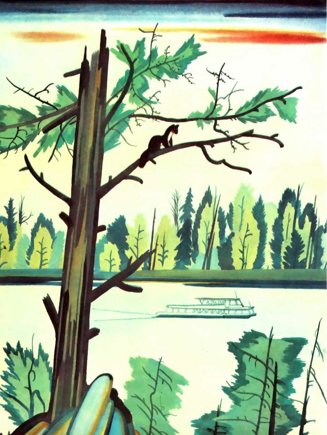 В своё первое путешествие мальчик тоже отправился по реке… За окном теплохода, за неширокой полосой воды, всё скользил и скользил берег, за кормой удивлённо и неохотно вскипала вода и, подобравшись, катила на две стороны волны. Берег часто менялся: то низкий, ярко-зелёный, на свежей зелени пасутся коровы, то за поворотом сразу яр, наверху постройки, вниз, к воде и лодкам, ведут ступеньки, возле лодок прыгают, что-то кричат и машут руками ребятишки, возле домов, прикрываясь от солнца ладошками, стоят взрослые. Вот и солнце ушло, на берега легла сплошная густая тень, и только у самой воды, узкой полоской желтел каменишник. Горы вдали, молчаливые и низко сгорбленные, заволакивало серой, едва уловимой дымкой. Кое-где уже пробивались огоньки, но, помигав, пропадали, растворялись в неверном и зыбком свете сумерек. Небо казалось подтаявшим, размытым, звёзды на нём ещё не проклюнулись, горизонт мягко и невидно сливался с землёй. Мерно и приглушённо шумела за бортом вода, да от катившейся по камням волны долетало осторожное и ленивое журчание.