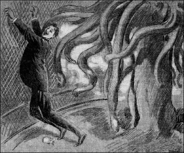 (Извлечение из лондонской «Таймс», 8 февраля 1909 г.) В связи с безвременной смертью профессора Ньютона, чьей мудрости и мужеству мир обязан своим спасением, меня попросили написать для первой газеты новой эры нечто вроде отчета о появлении ужасного сорного растения, которое заполонило землю и угрожало уничтожить человечество. Профессор намеревался выяснить происхождение сорной травы, ее отношение к обычным растениям, характер ее видимого роста и окончательную форму, которую приняла бы поросль. К сожалению, его заметки по этим вопросам сильно сокращены, полны технических деталей и остаются мне непонятны; кроме того, лично я не обладаю достаточными знаниями для рассмотрения научных аспектов дела. Поэтому мне придется ограничиться простым описанием событий, свидетелем которых я был.В девять часов вечера 10 ноября 1908 года я вышел из своей конторы на Норфолк-стрит, воспользовавшись запасным ключом, полученным от швейцара. Сначала я подумал, что идет снег; но когда я протянул руку и поймал несколько «снежинок», то увидел, что это были хрупкие белые семена, чем-то похожие на семена дыни, только менее плотные. Там, где они лежали на дороге кучами, показавшимися мне сугробами, их цвет казался серым. В конце улицы, на набережной, «сугробы» были выше; подойдя ближе, я обнаружил, что это были не семена, а поросль серой сорной травы. Трава обвилась вокруг моих ботинок, когда я попытался переступить через нее. Я наклонился и взял отросток, чтобы рассмотреть его; но когда я попытался сорвать его, он растянулся, как эластичная резина, не отломившись. Усики были круглыми и в нерастянутом состоянии имели около четверти дюйма в диаметре. На них виднелись шедшие через равные промежутки сферические выпуклости, напоминавшие на расстоянии маленькие ягоды. Они, по-видимому, состояли из того же вещества, что и усики. Отросток начал обвиваться вокруг моих пальцев, и мне лишь с некоторым трудом удалось их разжать. Улица и набережная были пустынны, но три или четыре лошади на стоянке извозчиков испуганно шарахнулись в сторону, когда трава обвилась вокруг их ног. За те несколько минут, что я наблюдал за ней, она заметно выросла. Чувствуя некоторую тревогу, я направился обратно по Норфолк-стрит. Сорняк распространился и там; я заметил, что в тех местах, где падало белое семечко, с поразительной быстротой всходило свежее растение. На Стрэнде трава была почти в ярд высотой. Водители конок нахлестывали своих испуганных лошадей в тщетных попытках проехать по ней. Пешеходы не могли пошевелиться, за исключением какого-то крупного сложения мужчины, который маленьким топориком прорубил проход в зарослях для себя, своей жены и дочери — хорошенькой девушки лет девятнадцати. Они спускались к набережной, но я предупредил их, что там все густо заросло травой. Молодая леди предложила спрятаться в одном из домов, и я пригласил их в свою контору. Отростки хватали людей, тянули их вниз и накрепко обвивали, как мух в паутине. Мы слышали крики и вопли по всему Стрэнду. Лошадь упала и билась, перевернув карету. Пока мы разговаривали, трава распространилась по Норфолк-стрит и стала цепляться за наши ноги, когда мы бросились бежать. Дама споткнулась и упала. Щупальца растения немедленно схватили ее, и только с большими усилиями нам удалось ее освободить. Войдя в дом, мы не смогли запере