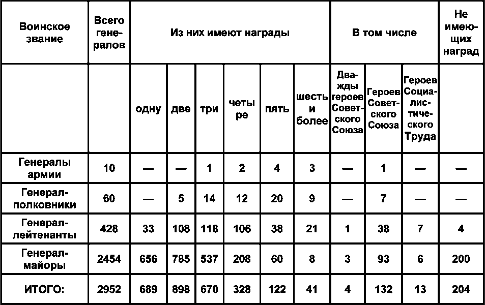 В декабре 1941 г. генерал-майору А.М. Василевскому было приказано в полной парадной форме и при орденах прибыть в кабинет Сталина для участия в приеме председателя Совета Министров Польской республики генерала В. Сикорского. В назначенный час будущий маршал переступил порог кабинета вождя. На его груди сверкал новенький орден Красной Звезды и юбилейная медаль «XX лет РККА». Видимо, шокированный таким «изобилием» наград, вождь спросил: — Товарищ Василевский, почему вы не надели остальные ордена? — Не надел потому, что других нет, — ответил Василевский. «На вопрос, за что и когда получил «Красную Звезду», ответил, что в декабре 1939 года за добросовестную работу в Генштабе во время советско-финляндского конфликта. Сталин, как мне показалось, удивленно покачал головой…». Можно допустить, что вождь впервые задумался: почему так мало наград у советских генералов? Но к этому вопросу ему еще придется вернуться в 1944 г. 18 мая 1944 г. генерал-полковник Голиков докладывал Народному комиссару обороны Маршалу Советского Союза товарищу Сталину: «… 5. О генералах, не имеющих наград: 204 генерала не имеют вовсе наград. Из них по должностям: Командующих армией — 3 чел. Членов Военного Совета — 4. Зам. командующих фронтов, округов и армий — 8. Нач. штабов армий и корпусов — 5. Командующих и зам. командующих, начальников спецродов фронтов, округов и армий — 7. Командиров корпусов — 6. Командиров дивизий, бригад и комендантов УРов — 22. Зам. командиров корпусов, дивизий — 8. Нач. училищ, школ, институтов, зам. и пом. нач. академий, училищ, нач. кафедр академий и преподавателей — 86. Нач управлений центр. и фронт. аппаратов, их заместит. нач. отделов, нач. служб, работников прокуратуры и военных трибуналов — 29. Прочих — 26. По стажу службы в Красной Армии: Свыше 20 лет — 183. до 20 лет — 6. до 15 лет — 8. до 10 лет — 2. до 5 лет — 5. Эти цифры являются дополнительным доказательством необходимости ввести законом награждение военнослужащих за выслугу лет (согласно моего представления от 14 апреля 1944 г. № 459643)…». Далее начальник Главного Управления кадров приложил к документу вот такую справку в виде таблицы 1.
