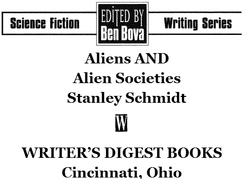 03 02 00 01 99 6 5 4 3 2 Library of Congress Cataloging-in-Publication Data Schmidt, Stanley. Aliens and alien societies / Stanley Schmidt. p. cm.—(Science fiction writing series) Includes bibliographical references. ISBN 0-89879-706-3 (alk. paper) 1. Science fiction—Authorship. I. Title. II. Series. PN3377.5.S3S24 1995 808.3'8762—dc20 95-25813 CIP Дизайн Анжелы Леннерт Уилкокс Иллюстрация на обложке Боба Эгглтона Перевод: Павел Волков, 2023 гг.О РЕДАКТОРЕ