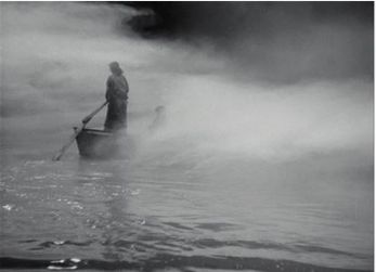 Тёрнер размывал контуры, добиваясь визуального слияния моря, атмосферы и кораблей, а в другой части света еще век спустя расфокусированное изображение станет способом создания совсем иной реальности. Это уже не символ любви, близости, грезы или бури. Посмотрите на кадр из фильма «Сказки туманной луны после дождя» 1953 года. Лодка, поглощаемая туманом, – прямо-таки тёрнеровский образ. При съемке этой сцены режиссер Кэндзи Мидзогути использовал длиннофокусный объектив, рассеянный свет, дыммашины, «фильтры размытия» и низкий контраст для того, чтобы переместить нас из трехмерной обыденности в плывущий мир. Действие происходит на озере Бива в конце XVI века. Двое крестьян, ведущие простую и тихую жизнь, мечтают о лучшей доле. Жены уговаривают их отказаться от честолюбивых замыслов, но тщеславие одерживает верх. Один из них, горшечник Гэндзюро, влюбляется в знатную даму, госпожу Вакаса, похвалившую его изделия. Она обольщает его и предлагает взять ее в жены. На этом знаменитом кадре он словно несет ее на своей спине.