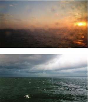 Цвет часто становился предметом споров. Ведь он повсюду, как время, и его роль трудно переоценить. Мы еще вернемся к цветовому восприятию, а сейчас давайте сосредоточимся на одном-единственном моменте: четыре часа пополудни, ноябрь, Северное море. Эти фотографии сделаны с разницей в шесть минут. Ни на одной из них нет избытка синего. Медно-оранжевый цвет на первой является дополнительным к серо-зеленому на второй. Первый снимок нечеткий из-за дождя. Мы видим горизонт – Z-глубина ощущается очень явственно. На фотографиях словно запечатлены все ранние стадии развития зрительного восприятия. Не таким ли было море в представлении Гомера? Можно различить винно-чермный цвет воды на первом снимке и серебристый на втором. Кто бы ни рассматривал эти фотографии, древний грек, Клеопатра, Гёте, Ив Кляйн, Ян Гамильтон Финлей или же мы с вами, можно с уверенностью сказать, что неожиданные цвета здесь ласкают глаз. Взгляд скользит по волнующемуся морю, устремляясь вдаль.