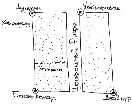 Это даже не карта. Это упрощенная до предела схема описываемого места действия. Сверху – север, снизу – юг. И Арктика и Антарктика Арракиса – сложные горные системы со снежными шапками на полюсах – да, как ни трудно в такое поверить, на Дюне есть снег и лед, и гораздо больше, чем на Земле; правда, никто из наших персонажей до этих высоких широт не добирался. С севера на юг, на многие тысячи миль простирается та самая пустыня, со всех сторон окруженная горами, а точнее сказать – высокими обрывами плоскогорий; в том же меридиональном направлении пустыню делит пополам Большой Рифтовый хребет, он же Центральный Рифт, и таким образом возникает то, что на местном жаргоне именуется Западной и Восточной песочницами, или иначе – название неправильное, но повсеместно распространенное – Западным и Восточным Рифтом. В горах юго-востока расположен город Джайпур, столица южных кланов, на северо-западе, за нагорьями Защитной Стены, лежат города Магриба, закатной страны, из которых нам интересен только Арракин, официальная столица Арракиса, чуть южнее которой, в отрогах уходящей к экватору все той же Защитной Стены, находится, наверное, самое прославленное место Дюны – съетч Табр. Вот пока и все, но даже этот нехитрый чертеж сразу приводит нас к первому географическому казусу приключений императора Муад’Диба.