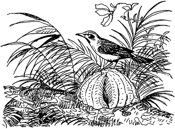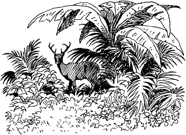 На следующий день, придерживаясь еле заметной тропы, мы набрели на заброшенную стоянку у небольшого ручья. Там стояло восемь хижин, вернее, простые навесы, вокруг которых были разбросаны скорлупы орехов кузи и большие раковины улиток. Судя по всему, двумя-тремя днями раньше в лагере побывало около шестнадцати человек. На некоторых деревьях поблизости были сделаны зарубки, свидетельствовавшие о том, что у индейцев были ножи, возможно украденные у поселенцев на Гонгужи. Пройдя еще с полмили, мы наткнулись на другую стоянку, более старую и побольше предыдущей, тоже забросанную скорлупой орехов кузи и раковинами улиток. Орехи кузи можно найти повсюду на Гонгужи; они растут на высоких пальмах гроздьями по нескольку сот штук и имеют очень твердую скорлупу, внутри которой находится от одного до трех маслянистых ядрышек размером примерно вдвое больше миндалины. Вкусом они похожи на кокосовые орехи, и местные индейцы, по-видимому, высоко их ценят как пищевой продукт. Неподалеку от стоянки мы увидели разоренное пчелиное гнездо; надо думать, что мед местные индейцы также употребляют в пищу. Очевидно, и большие улитки хороши на вкус, но где их можно найти, нам так и не удалось выяснить; улитки нам не попадались, а то бы мы не преминули их попробовать.
