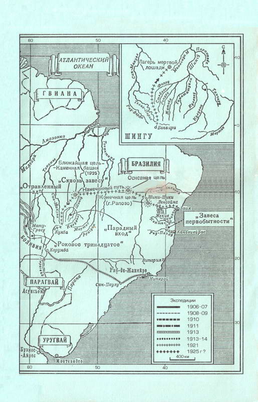 …Я познал горечь неудач, но дело постоянно подвигалось вперед. Если бы Костин и Мэнли все еще были у меня компаньонами, возможно, вместо неоконченной рукописи я смог бы уже сейчас представить миру историю удивительнейшего открытия новейшего времени. Случались у меня и разочарования. После экспедиции в Гонгужи я некоторое время сомневался в существовании древних городов, но затем я увидел руины, свидетельствовавшие об истинности хотя бы части рассказов. Все еще представляется возможным, что моя главная цель «Z» с остатками исконного населения не что иное, как город в лесу, обнаруженный Рапозо в 1753 году. Он находится не на реке Шингу и не в Мату-Гросу. Если нам суждено когда-нибудь достичь «Z», мы, вероятно, задержимся там на значительное время, ведь только безуспешные путешествия кончаются быстро. Наш нынешний маршрут начнется от Лагеря мертвой лошади (11°43′ южной широты и 54°35′ западной долготы), где в 1921 году погибла моя лошадь, и пойдет примерно в северо-восточном направлении, к реке Шингу. По пути мы обследуем древнюю каменную башню, наводящую ужас на живущих окрест индейцев, так как ночью ее двери и окна освещены. Пересекши Шингу, мы войдем в лес где-то на полпути между этой рекой и Арагуаей, потом возьмем севернее по водоразделу до 9–10° южной широты. Затем мы направимся к Санта-Мария-ду-Арагуая и оттуда по тропе пойдем к реке Токантинс у Порту-Насионал или Педру-Афонсу. Наш путь проляжет между 10°30′ и 11° южной широты до высокогорья между штатами Гояс и Баия — к совершенно не исследованному и, если верить слухам, густо заселенному дикарями району, где я рассчитываю найти следы обитаемых городов. Горы там довольно высоки. Затем мы пойдем горами между штатами Баия и Пиауи к реке Сан-Франсиску, пересечем ее где-то около Шики-Шики и, если хватит сил, посетим старый покинутый город 1753 года, который лежит примерно на 11°30′ южной широты и 42°30′ западной долготы. На этом наша экспедиция закончится, и, выйдя к железной дороге, мы поездом доедем до Баии[74]. Я имел беседу с одним французом, который несколько лет искал легендарные серебряные рудники, косвенным образом связанные с покинутым городом (ведь именно при поисках затерянных рудников Мурибеки отряд Рапозо открыл его в 1753 году). Француз утверждает, что исходил вдоль и поперек весь район, который я предполагаю посетить, что эта местность населена цивилизованными поселенцами повсюду, где есть вода, что настоящих лесов там нет и никаких развалин не может быть! По его словам, он лишь обнаружил выветрившуюся причудливых форм формацию песчаника, которую можно принять на расстоянии за древние развалины, и он уверен, что именно ее увидели в 1753 году участники отряда Рапозо, а потом уже в духе времени выдумали все остальное. Когда я рассказал ему о надписях, о которых они сообщали (он никогда не видел документа, оставленного Рапозо, и ничего не слышал о нем), он не нашелся что ответить; во всяком случае, различные существенные детали явно не вяжутся с его рассказом. Надписи на руинах и «прыгающие крысы» (тушканчики) безусловно не могли быть чистой выдумкой. По правде сказать, француз не внушал доверия. Исходить вдоль и поперек весь этот район вряд ли возможно. Там есть песчаные пространства, лишенные воды; крутые утесы преграждают путь; хотя бы одна-единственная долина может оставаться там скрытой от г
