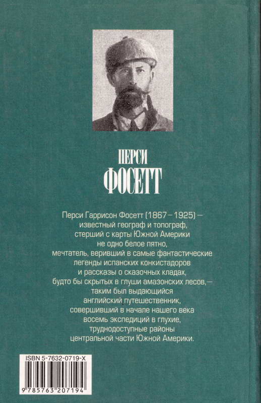 Перси Гаррисон Фосетт (1867–1925) — известный географ и топограф, стерший с карты Южной Америки не одно белое пятно, мечтатель, веривший в самые фантастические легенды испанских конкистадоров и рассказы о сказочных кладах, будто бы скрытых в глуши амазонских лесов, — таким был выдающийся английский путешественник, совершивший в начале нашего века восемь экспедиций в глухие, труднодоступные районы центральной части Южной Америки.