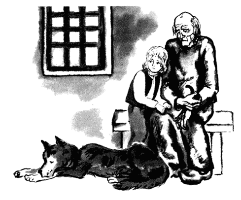 В снежный зимний день Нелло и Патраш шли за гробом старика. Никто больше не провожал его на кладбище – только юный внук и старая собака. «Теперь он, наверно, смягчится и позволит горемыке приходить к нам», – думала мельничиха, поглядывая на мужа, который, сидя у очага, курил трубку. Когес догадывался, о чём она думает, но он ожесточил своё сердце и не отворил дверь, когда жалкая похоронная процессия проходила мимо. «Мальчик – нищий, – сказал он про себя, – незачем Алоизе водить с ним знакомство». Жена не смела возражать. Однако после похорон, когда Нелло и Патраш прошли мимо их дома, она послала Алоизу положить маленький венок из бессмертников на свежий могильный холмик, ещё не занесённый снегом. Нелло и Патраш с тяжёлым сердцем возвращались домой. Даже этого убогого, унылого жилья они должны были лишиться. Нелло целый месяц не вносил арендную плату за домишко, и, когда расплатился за похороны, у него не осталось ни одной монетки. Он пошёл просить отсрочки у хозяина лачуги, сапожника, который был приятелем Когеса. Но от хозяина нечего было ждать сострадания. Это был жестокий и жадный человек. Он вынес из мазанки всё, что там было, до последней ложки и плошки, а Нелло и Патрашу велел убираться подобру-поздорову на следующее утро. Как ни убог был их дом, они его любили. Они были счастливы здесь. А летом, увитый виноградом и цветущей фасолью, он казался таким красивым среди освещенных солнцем полей. Настал канун рождества. Нелло поднялся на заре и крепко обнял своего единственного друга. Горючие слёзы закапали на голову верного Патраша. – Пойдём, Патраш! Пойдём, милый! – шептал он. – Не будем ждать, пока нас выгонят отсюда. Пойдём! Патраш послушно поднялся, и они вместе вышли из лачуги. Проходя мимо зелёной тележки, Нелло грустно опустил голову. Тележка больше не принадлежала ему – хозяин взял её в уплату за долг: на снегу валялась упряжь Патраша с медными бубенчиками. Они пошли по знакомой дороге в Антверпен. Едва брезжил утренний свет, ставни почти везде были закрыты, но кое-кто в деревне уже встал. У одной открытой двери Нелло остановился: дедушка не раз оказывал услуги семье, которая жила в этом доме. – Не дадите ли вы Патрашу корочку хлеба? – робко спросил мальчик. – Он стар и со вчерашнего дня ничего не ел. Хозяйка быстро захлопнула дверь, пробормотав, что в этом году рожь очень вздорожала. Нелло и Патраш устало поплелись дальше и больше нигде не останавливались. С трудом добрались они до Антверпена, когда часы на городской башне пробили десять. «Если бы у меня было хоть что-нибудь, что можно продать, я купил бы кусок хлеба для Патраша», – думал Нелло. Но, кроме фуфайки и штанов на теле да деревянных башмаков на ногах, у него ничего не было. Патраш, словно поняв, чем он озабочен, ткнулся носом в ладонь мальчика. В полдень должны были объявить, кто получил премию за лучший рисунок. Нелло направился к дому, где оставил своё сокровище. На ступеньках, у входа и в передней толпились юноши – иные его лет, другие постарше, и все со своими родителями, родственниками или друзьями. Сердце Нелло сжалось от страха, когда он вместе с Патрашем вмешался в эту толпу. Городские часы гулко пробили двенадцать. Дверь в зал открылась, и нетерпеливая, взволнованная толпа ринулась вперёд. Все знали, что рисунок, получивший премию, будет выставлен на высоком помосте. Глаза 