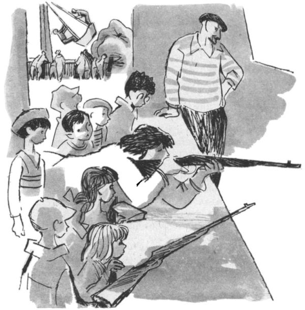 Представляешь, какое надо иметь самообладание и выдержку, чтобы под огнём, под пулями наблюдать за врагом! Когда наши ворвались наконец в Тихвин, взвод, в котором служили Пчёлка и Котов, пробрался к фашистскому пулемётному расчёту, державшему под обстрелом главную улицу. Вплотную подползли, швырнули в него одну за другой две гранаты. Это открыло путь нашим. За взятие Тихвина Пчёлка и Котов были награждены орденами Красного Знамени. В землянке, помню, был настоящий пир. Сам генерал приехал поздравить смелых разведчиков. Мальчика, которого ты видишь на второй фотографии, я сама не встречала во время войны. Фотографию его взяла потому, что на ней видна опасная служба разведчика в тылу врага. Смотри, идёт по пустынной улице деревни паренёк. Вокруг как будто всё вымерло. Даже дым не подымается из труб. Все спрятались от эсэсовцев, которые расположились в этой деревне. Покажись на улице взрослый партизан, его сразу схватят, а на мальчишку не обратят внимания. Посмотри, как насторожён мальчик, как зорко следит он за тем, что делается за его спиной. Что там? Прибыли новые части противника, подвезли технику? Намётанным взглядом Тимоша Гиль замечает каждую мелочь. Ценные сведения принесёт он партизанам. Представляешь, какому риску подвергал себя Тимоша и каким он был смелым: ведь он был один среди врагов! А третий снимок я назвала бы «счастливый день». Фашистов прогнали, и партизаны вышли из леса. На груди у каждого блестят только что полученные боевые партизанские медали. Награждены и ребята, Миша Ярук с Юрой Тарчинским. Они были вместе со взрослыми в отряде народных мстителей — так у нас называли партизан. А что происходит здесь? Погляди на четвёртый снимок. У фашистов была подлая повадка: отступая, они всё сжигали и взрывали. И вот этот гитлеровец спрятался в сарае, чтобы в последний момент поджечь шахтёрский посёлок Огарёвка. Его выследили ребята. Сказали взрослым. Гитлеровца схватили. Ребята радуются: они помогли сохранить родной посёлок. В войну каждый старался помочь нашей армии как мог. В доме, где жил Валерик Февралёв, фашисты устроили склад боеприпасов. Валерик тайком утащил и спрятал несколько ящиков с патронами. Ни один из этих вражеских патронов, ни одна пуля не причинили вреда нашим солдатам. На пятой фотографии, видишь, Валерик отдаёт ящики с патронами командиру советских партизан. Незачем держать патроны в тайнике — свои пришли! Вот такое военное детство было у этих ребят. Будь здорова, Ярка. Напиши, что ещё тебе прислать для уголка «Советский пионер». Нина.