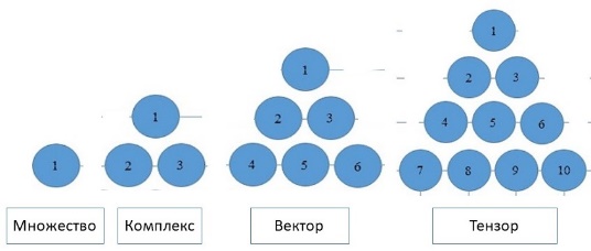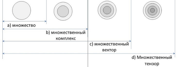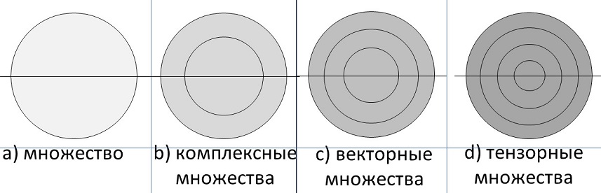 2. Метрологический признак. Единичные элементы этих множеств являются их единицами измерения и представляют собой единственную меру количества. Это, так называемые, одномерные множества. Все первичные объекты обладают одновременным вращением и перемещением, поэтому одно и тоже множество имеет, с одной стороны, пространство, занятое плотными вращающимися элементами, а, с другой стороны, разреженное пространство, как область их существования при вечном движении. Это двумерное множество или комплексное множество. Один и тот же элемент в зависимости от его величины и скорости движения может обладать в разное время тремя фазовыми состояниями, подобными состояниям воды. Но все множество разных по величине объектов одновременно имеет три состояния, как например, состояния всех химических элементов на Земле. Это трехмерные множества или векторные множества. Одни и те же объекты могут находиться в четырех состояниях. Например, из древесины дуба можно изготовить предмет культурного назначения, а можно его химически переработать на дубовый экстракт или использовать на механические цели, а можно просто сжечь как топливо. Это четырехмерные множества или тензорные множества. Схематично это можно представить следующим образом (рис. 8):