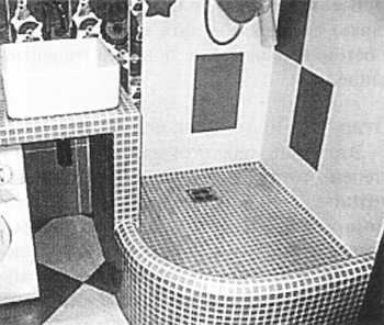 Простой и удобный вариант душа, который лишь условно можно назвать кабиной: угол, обозначенный мозаичным фундаментом, оснащенный душевым оборудованием и трапом для стока воды. Удобен для тех, кто ценит время.