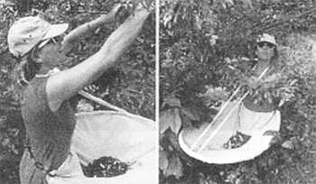 Чтобы во время сбора ягоды не падали на землю, из старого обруча и обрезка ткани можно смастерить необычный фартук. Конструкция чем-то напоминает большой сачок для ловли бабочек. Самоделка позволяет собирать урожай слегка потряхивая отдельные веточки. Это ускоряет процесс и сокращает количество потерянных ягод.