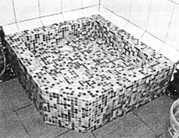 Этап #6: Укладка керамической плитки Клеевой раствор готовим непосредственно перед нанесением, так как он имеет ограниченный срок годности. Плитку выбираем по вкусу, но с единственным условием — она должна гармонично сочетаться с интерьером ванной комнаты и не скользить. Это может быть керамика 30 см х 40 см, плитка 10 см х 10 см, мозаика, однако учтите, что детали крупного размера придется резать, потому что площадь поддона невелика (примерно 0,9 м х 0,9 м), к тому же облицовывать бортик, расположенный по периметру, легче маленькими по размеру элементами или мозаикой, которую легко разделить на небольшие кусочки. Укладывая плитку, помним про наклон в сторону трапа. Укладку плитки начинаем с центрального (дальнего) угла — места, куда в первую очередь падает взгляд. Мозаику использовать легче, так как ее легко разрезать на удобные фрагменты, однако не забываем, что необходима идеально ровная поверхность.