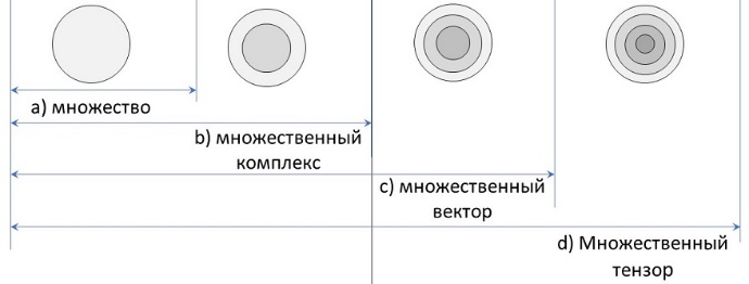 Рисунок 4. Количественная интерпретация первичных математических объектов. 2. Метрологический признак. Единичные элементы этих множеств являются их единицами измерения и представляют собой единственную меру количества. Это, так называемые, одномерные множества. Все первичные объекты обладают одновременным вращением и перемещением, поэтому одно и тоже множество имеет, с одной стороны, пространство, занятое плотными вращающимися элементами, а, с другой стороны, разреженное пространство, как область их существования при вечном движении. Это двумерное множество или комплексное множество. Один и тот же элемент в зависимости от его величины и скорости движения может обладать в разное время тремя фазовыми состояниями, подобными состояниям воды. Но все множество разных по величине объектов одновременно имеет три состояния, как например, состояния всех химических элементов на Земле. Это трехмерные множества или векторные множества. Одни и те же объекты могут находиться в четырех состояниях. Например, из древесины дуба можно изготовить предмет культурного назначения, а можно его химически переработать на дубовый экстракт или использовать на механические цели, а можно просто сжечь как топливо. Это четырехмерные множества или тензорные множества. Схематично это можно представить следующим образом (рис. 6):