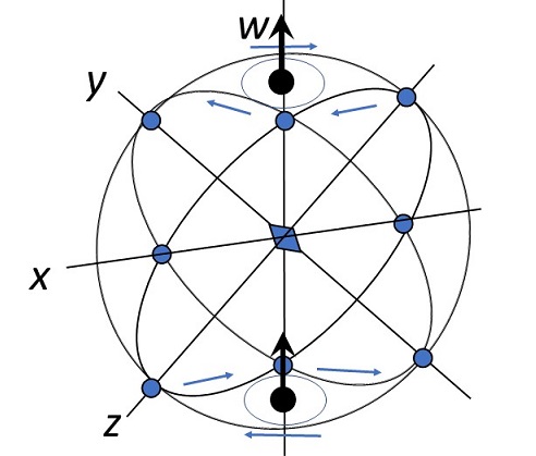 Чтобы понять физический смысл четвертого измерения, необходимо осознать, что материальная среда является неопределенной первичной субстанцией в Природе. Никто не знает и никогда не узнает, что это такое. А причина объективно проста — это недоступно человечеству, поэтому все околонаучные споры по этому поводу бесполезны. Зато все знают, что материя существует и содержит неизвестное вещество, которое условились измерять массой. Эту субстанцию называют материей. Естественно предположить, что формой минимального первичного материального объекта является сфера, такая же как у всех космических объектов. Эти материальные элементы одновременно вращаются и перемещаются перпендикулярно плоскости вращения. Это тепловая энергия, определяемая по классической формуле. Здесь следует иметь в виду, что в этой формуле не квадрат какой-то одной скорости, а произведение равных по величине окружной и линейной скоростей. Если одна уменьшается, то другая симметрично увеличивается, а произведение становится меньше квадрата. Оба вида движения материальных объектов осуществляются либо в одном направлении, либо в противоположном. Соотношение количеств положительных и отрицательных элементов определяют температуру среды, которая может быть теплой, холодной или нейтральной, т. е. равной нулю. Но это не нуль, в котором ничего нет. И не абсолютный нуль, который в принципе не достижим. Именно противоположные элементы и определяют виды их взаимодействий в зависимости от мест соприкосновения. Могут быть случайные столкновения одноименных элементов, а могут сталкиваться разноименные элементы. При этом имеет значение столкновения боковыми поверхностями или полярными точками. Случайные столкновения создают четыре вида энергии. Трехмерное вращение в трех перпендикулярных плоскостях образуется за счет воздействия на периферию плоскости вращения, преобразуя тепловую энергию в магнитную, магнитную в электрическую. Четырехмерное вращение образуется несколько иначе. Если взять небольшой мячик, и наклеить на него изоленту с нанесенными стрелками перемещения вдоль и вращения поперек, то можно видеть, что образуются па противоположных сторонах два полюса: треугольники с разным направлением вращения по длине и с одинаковым направлением поступательного движения по ширине изоленты. Образуется два вихря, один расширяющийся наружу, а другой — сужающийся внутрь. Это иллюстрирует рис. 10.