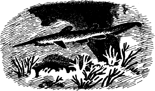 Сокол-сапсан, высматривая что-то на земле и то снижаясь и замедляя полет, то вновь взмывая ввысь, тенью мелькнул в небесах, и обычно плаксивый крик его превратился в громкое стаккато, разнесшееся по всему ущелью. Когда сапсан в очередной раз резко взмыл ввысь, стая серокрылых кекликов, вспугнутых им, пролетела невысоко над землей и опустилась на другом конце пропасти. Заметив хищно кружившего над ними и готового спикировать сапсана, кеклики бросились спасаться, а одна птичка побежала вниз по северному склону, вторая же спряталась за ту скалу, где притаился Пятница.