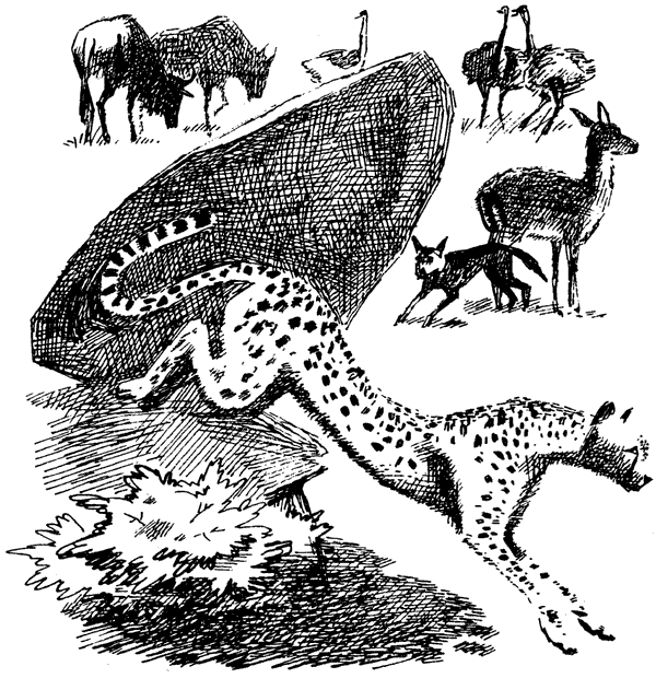 Пятница сидел на плоском камне, еще хранившем дневное тепло, и наблюдал за медленно подкрадывающейся темнотой. Зрачки его расширились, чувства были напряжены до предела; ожидая, когда уляжется ветер, он пару раз зевнул и стал вылизывать прежде всего пах и живот. День был холодный, ветреный; в воздухе чувствовалось леденящее дыхание снегов с далеких гор на юге. Порывы ветра своими холодными пальцами ворошили шерсть кота, раздували усы, но особого впечатления, впрочем, на него не производили — спасал густой пушистый подшерсток. Пятница поморгал, и молочного цвета защитные пленки, прикрывавшие глазные яблоки, извлекли крохотные песчинки, попавшие в глаза, когда он неотрывно смотрел на юг, как и всегда перед очередным долгим переходом. У него за спиной, уже отчасти стершиеся в памяти, были четыре с половиной месяца осенних и зимних странствований, более тысячи километров пустыни. Вперед он продвигался медленно, однако же для него это особого значения не имело и совершенно не меняло ровного ощущения взятого ранее следа. Безжизненные днем, как это могло показаться, равнины, монотонно сменявшие одна другую, ночью кишели жизнью: здесь было полно шакалов, лисиц, мангустов, земляных волков, хорьков, генетт, барсуков, дикобразов и мелких чернолапых диких кошек — ближайших родственников Пятницы. Всех этих зверей он не особенно опасался, но порой обстоятельства заставляли его пересекать охотничьи территории больших диких котов, а встречи с этими тварями всегда были очень неприятны. Линия его пути неизменно имела форму зигзага, поскольку шел он по руслам высохших рек. Реки отыскать было нетрудно — зеленые полосы колючей растительности среди почти голой пустыни; деревья, как и всегда, давали Пятнице и тень в лунные ночи, в которой ему легко было укрыться, и убежище, и пищу; возле них он часто находил и случайно сохранившиеся водоемы. Все это было не менее важно и для всех прочих хищников, так что Пятница редко оставался в одиночестве: вечно поблизости оказывался совершенно нежелательный сосед. Пищей некоторым животным служили такие, казалось бы, совершенно несъедобные вещи, как древесные грибы, росшие на колючих акациях, и смолы, которые выделялись сквозь трещины в коре; однако Пятница всегда мог поймать ночью песчанку или водяную крысу, а днем — полосатую мышь-полевку. А как-то раз на каменистой тропке, укрытой травой и низкорослым кустарником, поймал даже молодого рыжего капского дамана и пообедал на славу. Днем эти суровые края, словно забытые всеми, кроме солнца, казались пустынными, заброшенными, и жизнь здесь проявлялась лишь в виде парящего в небесах чернокрылого коршуна или орла, озиравшего вельд в поисках стинбока. Когда одно из этих наполнявшихся водой лишь в период дождей русел рек поворачивало слишком сильно на запад, Пятнице приходилось пробираться по открытой местности до другой пересохшей речки, и лишь луна видела, как с каждой неделей он все ближе подходил к горам, к возделанным полям в долинах, окруженным более мощными и густыми деревьями. Зима вела свои последние жестокие бои перед отступлением. Однако самый холодный период путешествия Пятницы был еще впереди.