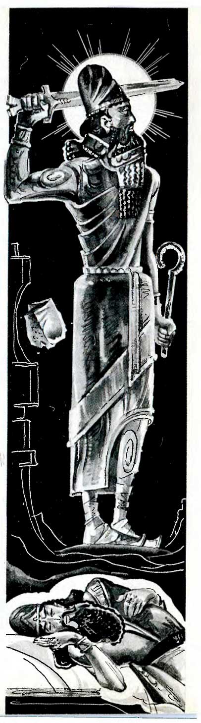 ⠀⠀ ⠀⠀ ⠀⠀ Долго жил Навуходоносор на свете, но вот наконец и за ним смерть пришла. После Навуходоносора стал царствовать его наследник Валтасар. Грозный Навуходоносор хотел оставить по себе славу великую, строил дворцы и башни, сажал сады, воевал с другими народами. А Валтасару ничего этого не надо: день прожил, и ладно. Но был Валтасар такой же злодей, как и Навуходоносор: мучил народ тяжёлой работой и казнил непокорных жестокими казнями. Задумал Валтасар устроить пир у себя во дворце. А в ту пору собрался царь персидский идти войной на Вавилон. Валтасару говорят: — Помилуй, государь, к нам враг войной идет, а ты пиры затеваешь. А царь отвечает: — Что ж, что война? На то у меня и воины, чтобы от врага отбиваться. На то и стены неприступные, каменные, чтобы враг об них поломал свои копья. Позвал к себе во дворец тысячу гостей именитых, и пошел у них пир горою. Вокруг столов разместились нарядные гости — кто в красном, кто в зелёном, кто в синем. На головах у всех повязки пёстрые, на ногах золотые сандалии. А сам царь Валтасар на шёлковых подушках развалился. Его царская одежда вся как радуга переливается, на груди большой алмаз сверкает. Бесшумно снуют царские слуги, кушанья диковинные разносят, душистые вина разливают. И светло во дворце как днём: тысячи светильников горят. Музыка гремит. Гости поют, смеются, славят царя Валтасара. И вдруг все светильники разом погасли, словно их ветром задуло. Стало темно. Тогда где-то наверху, у стены, появилось слабое мерцание. С каждой минутой оно разгоралось все больше и больше, и все увидели огромную руку, окружённую ярким сиянием. Огромный палец водит по стене и пишет, пишет, а что — неизвестно. Стало тихо во дворце. Оборвался смех. Умолкла музыка. Валтасар приподнялся на подушках и смотрит на стену, дрожит, сам белый, как стена. ⠀⠀ ⠀⠀ ⠀⠀