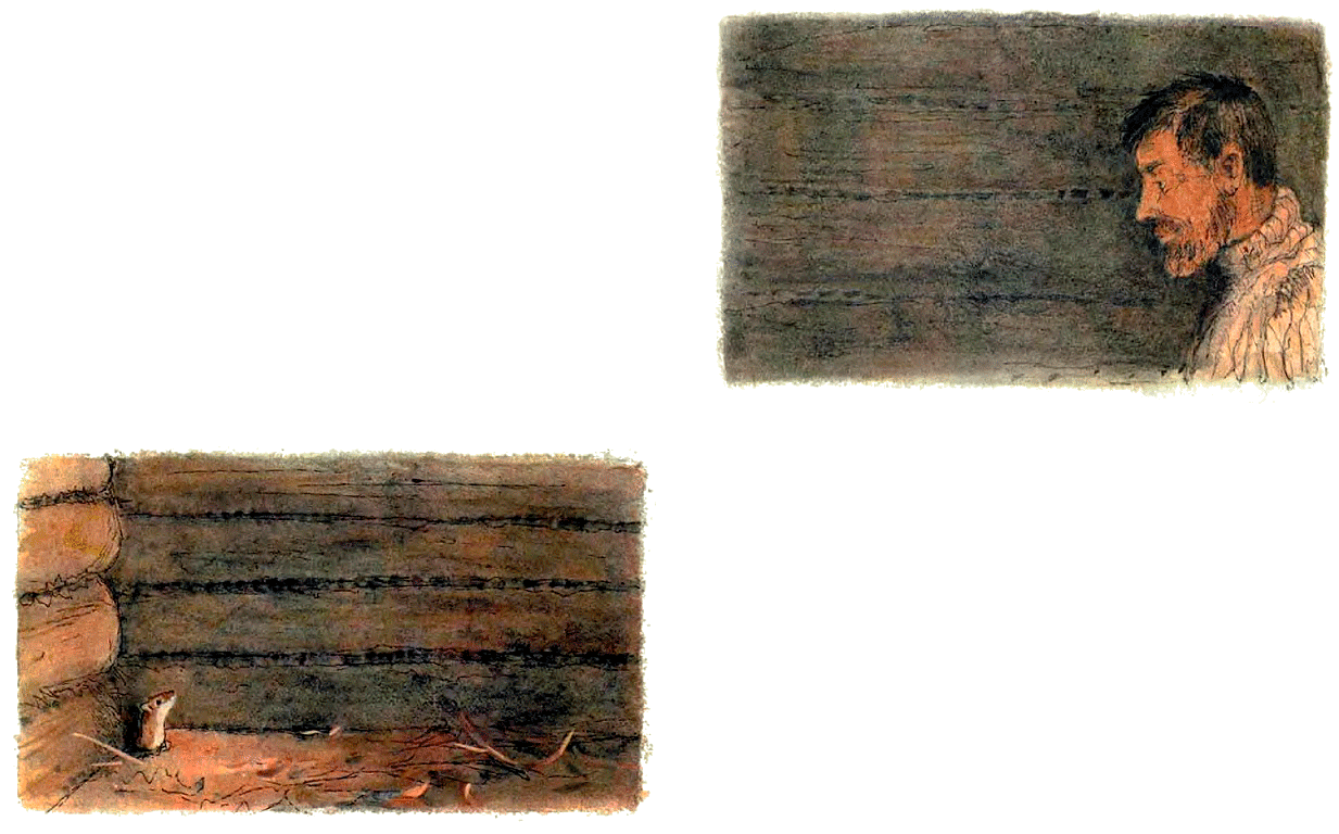 ⠀⠀ ⠀⠀ Я разжигаю примус и готовлю завтрак. Позавтракав, иду в маршрут. Маршруты у меня долгие, часов по пятнадцати на ногах, даже больше. Возвращаюсь уже в сумерки. На небе высыпают звёзды, яркие, начищенные; луна освещает сопки, словно отлитые из фиолетового стекла, и временами мне начинает казаться, что я вообще один на целой земле и нет никаких городов, нет светящихся реклам и спешащих куда-то людей. Мне было одиноко. Я мечтал о друге. И очень ругал себя за то, что не взял собаку. Однажды ночью я сидел на нарах, за столиком, писал, курил, чай прихлёбывал. Вдруг раздался шорох — я насторожился. — Наверное, лемминг — полярная мышь, — сказал я сам себе: привык в одиночестве думать вслух. Шорох повторился. Я приподнял коптилку. Тени на красноватых от света стенах зашевелились, и я заметил в углу маленькую головку. Сверкнули в темноте зелёные глаза, и головка тут же исчезла. Мне даже показалось, что это человеческая головка. А куда она исчезла — непонятно, некуда ей деться. Кто бы это мог быть? Я поднялся и заглянул в угол. Здесь была нора не больше мышиной. Только я вернулся за стол, шорох опять повторился. Я сделал вид, что ничего не вижу, лишь осторожно косил глазами в угол. В углу фыркнул и появился горностай. Я боялся дышать, чтобы не спугнуть его. Он присел на корточки, вытянулся столбиком и принялся рассматривать меня, а я его. ⠀⠀ ⠀⠀