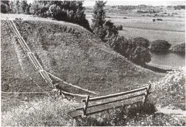 Еще левее этой «соловьиной рощицы» от домика няни спускается вниз узкая аллейка, совершенно скрытая высокими кустами акации — настоящий зеленый лабиринт. Аллейка завершается внизу площадкой, на которой стоит белая садовая скамья. Если отсюда смотреть в сторону ветряной мельницы, то в небольшом отдалении за нею хорошо видна Савкина горка — одно из интереснейших мест Пушкинского заповедника.