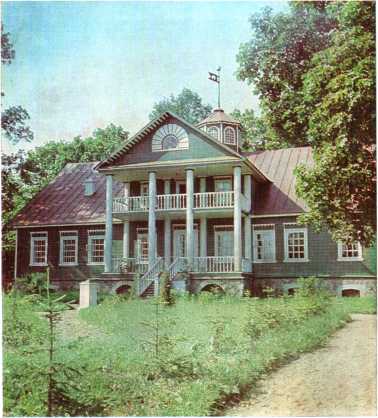 Через год, в сентябре 1827 года, когда Пушкин вновь гостил в Михайловском, его навестил тригорский приятель А. Н. Вульф и в своем дневнике отметил: «Вчера обедал я у Пушкина в селе его матери, недавно бывшем еще месте его ссылки... По шаткому крыльцу взошел я в ветхую хижину первенствующего поэта русского...» Сестра А. Н. Вульфа по матери, М. И. Осипова, тогда еще ребенок, в те годы также не раз бывала в доме Пушкиных в Михайловском, о котором потом рассказывала: «Вся мебель, какая была в домике при Пушкине, была ганнибаловская. Пушкин себе нового ничего не заводил. Самый дом был довольно стар. Мебели было немного, и вся-то старенькая... Вся обстановка комнаток Михайловского была очень скромна...» В описи села Михайловского, «учиненной опочецким земским исправником Васюковым» 19 мая 1838 года, об этом доме говорилось: «Дом деревянного строения на каменном фундаменте, крыт и обшит тесом длиною 8, а шириною 6 сажен. К нему подъездов с крыльцами 2. Балкон 1. В нем печей голландских кирпичных белых с железными дверцами и чугунными вьюшками 6. Дверей столярной работы распиленных на медных петлях с таковыми же внутренними замками 4. Одиноких столярной работы на железных крюках и петлях с таковыми скобками 16. Окон с рамами и стеклами на крюках, петлях железных, таковыми же крючками и задвижками 14». После смерти поэта в Михайловском долгое время никто не жил, и дом, и усадьба пришли в запустение. «...По его кончине, — рассказывала М. И. Осипова,— вдова Пушкина также приезжала сюда гостить раза четыре с детьми. Но когда Наталья Николаевна (Пушкина) вышла вторично замуж — дом, сад и вообще село было заброшено, и в течение восемнадцати лет все это глохло, гнило, рушилось.<...> Наконец, в последние годы исчез и дом поэта: его продали за бесценок на своз, а вместо него выстроен новый, крайне безвкусный домишко — совершенно по иному плану, нежели как был расположен прежний домик». Сын поэта Г. А. Пушкин, перестраивая дом, сохранил, однако, старый фундамент, и это вместе с другими документами помогло потом, в 1949 году, восстановить дом (по проекту архитекторов Н. В. Яковлева и Л. И. Рожнова) в том виде, какой он имел при Пушкине. Длина дома по южному фасаду 24 метра, по северному — 17,8 метра, ширина 12,5 метра. В нем пять комнат и прихожая (передняя). Сейчас в этом доме находится музей, посвященный жизни и творчеству великого русского поэта в псковской деревне. В передней экспозиция рассказывает об истории пушкинской усадьбы со времени ее основания до наших дней, о первых приездах сюда Пушкина в 1817 и 1819 годах, о пребывании поэта в михайловской ссылке. Здесь представлены план владений Ганнибалов 1786 года, жалованная грамота императрицы Елизаветы (в копиях), литография сельца Михайловского 1837 года. Здесь же помещены картины В. Серова «Пушкин на прогулке» (копия), этюд художника Г. Веселова «Дом Пушкина», а также фотографии и пушкинские автографы (в копиях), раскрывающие тему экспозиции. На бюро пушкинского времени стоит небольшая пушечка-мортирка, которую нашли в 1954 году в Михайловском парке на глубине 50 сантиметров. На мортирке выгравировано: «Изготовлено в технич. артиллерийск. школе 1831». В этой комнате произошла встреча опального поэта с приехавшим навестить его в ссылке И. И. Пущиным. Из передней двери направо ведут в кабинет Пушкина, налево — в комнату няни. «...Вход к нему, — отмечал И. И. 