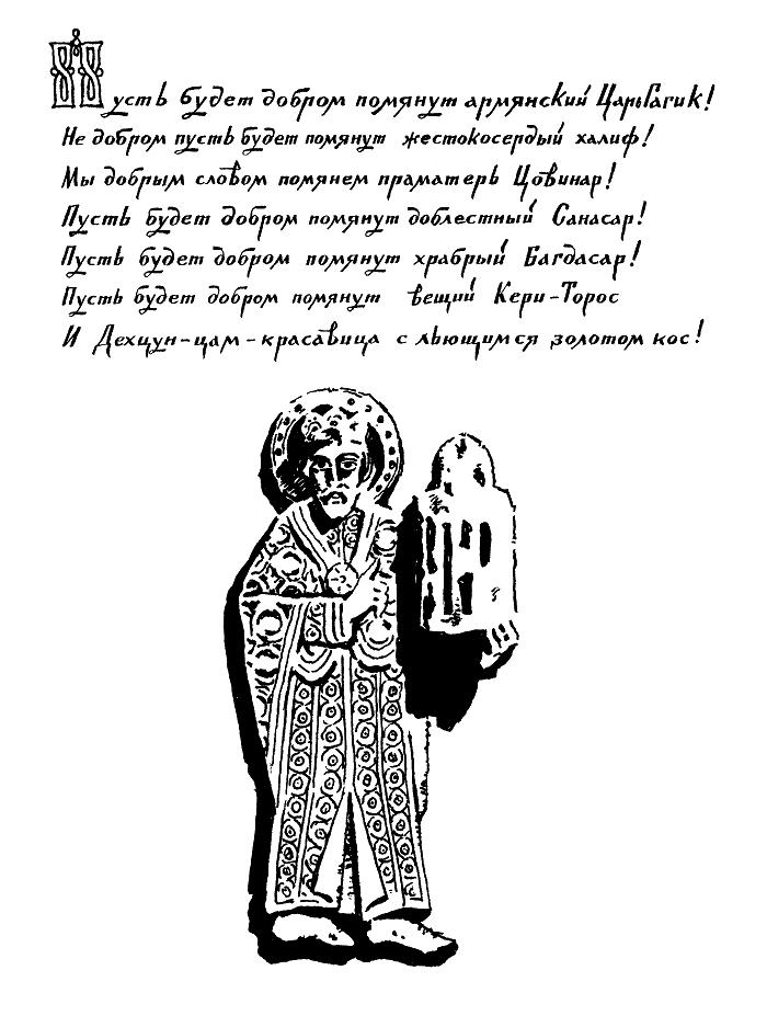 ⠀⠀⠀ ⠀⠀ ⠀ Почти сто лет назад, в 1874 году, в одной из типографий Константинополя, тогдашней столицы Оттоманской империи турок, была напечатана книга известного армянского ученого-фольклориста Гарегина Срвандзтянца «Гроц у броц ев Сасунци Давид кам Мгери Дур», что в переводе означает: «Из книг и из уст и Давид Сасунский или Дверь Мгера». Книга эта стала событием в истории армянской национальной культуры. Она знакомила читателей с первой записью (первым вариантом) армянского героического эпоса, сохранившегося в устах сказителей под несколькими названиями: «Сасна црер» («Неистовые из Сасуна»), «Джоджанц тун» («Дом великих», «Дом исполинов»), «Каджанц тун» («Дом храбрых»), но более всего известного как «Давид Сасунский» — по имени главного героя третьей части («ветви») повествования. В богатейшей сокровищнице духовных ценностей, созданных армянским народом на протяжении многих столетий, эпос «Давид Сасунский», конечно же, самое прекрасное творение, проникнутое сильным и неподдельным чувством любви к родине, утверждающее добро, красоту, благородство, верность и братство между людьми. Связанный с одной из горных областей Армении — Сасуном, эпос «Давид Сасунский» — наиболее полное выражение надежд и чаяний всего армянского народа, и потому его герои — герои не только Сасуна, но всей земли армянской, всей Армении. Эпосу армян — тысяча лет. Его начали слагать в десятом веке, под впечатлением событий того времени — борьбы армянского народа против Багдадского халифата за свою свободу и независимость. Эпос изустно передавался из поколения в поколение сказителями, пользовавшимися огромным уважением у слушателей. Это были по преимуществу кочевавшие в поисках заработка ремесленники — шерстобиты, чесальщики, ткачи и крестьяне-земледельцы. Они не давали погибнуть эпосу, ревностно следили за точностью повествования, берегли чистоту и прозрачность его. Память о героях эпоса была священна: их имена, как имена самых близких людей, сказители с особым чувством уважения произносили в зачине каждой «ветви» (части) эпоса… Но шли годы, пролетали десятилетия и века. На армянском языке, начиная с конца четвертого века, когда Месроп Маштоц создал армянскую письменность, были написаны сотни стихотворных, прозаических, научных книг, но эпос «Давид Сасунский» между тем существовал лишь в формах устных сказов. Здесь хочется снова вспомнить о научном подвиге, совершенном Гарегином Срвандзтянцем. Более трех лет он посвятил поискам эпоса, его сказителей. В июне 1873 года пришла удача. Ученый из Константинополя познакомился с Крпо — деревенским церковным старостой из Арниста, который оказался на редкость интересным человеком. Он сообщил много любопытных сведений о среде, в которой распространялся эпос, о своем учителе и его двух учениках, знавших в совершенстве все повествования, и еще о многом другом. Целых три дня Крпо, на мушском диалекте армянского языка, «сказывал свой сказ», который и был записан, а вскоре и обнародован Г. Срвандзтянцем. Так произошло «письменное закрепление» первого варианта «Давида Сасунского». Спустя тринадцать лет, в 1886 году, крупнейший исследователь армянского народного творчества Манук Абегян записал второй, так называемый мокский, вариант эпоса. Еще через три года ученик Манука Абегяна Гарегин Овсепян в поселениях на