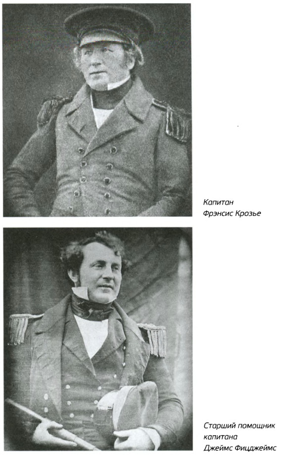 КОРАБЛЬ ЕЕ ВЕЛИЧЕСТВА «ТЕРРОР» Капитан: Фрэнсис Рэндон Мойра Крозье. Лейтенанты: Эдвард Литтл, Джон Ирвинг, Джордж Г. Годгсон. Помощники: Роберт Томас, Фредерик Джон Хорнби. Второй штурман: Жиль А. Мак-Бин. Хирург: Джон С. Педди. Второй врач: Александр Мак-Дональд. Секретарь: Е. Дж. Г. Хелпман. Действующий штурман: Томас Бланки. Мичманы: Томас Хони (плотник), Джон Лэйн (боцман), Джеймс Томпсон (инженер). Старшины: Ройбен Мэйл (старшина бака), Томас Джонсон (помощник боцмана), Джон Торрингтон (старший кочегар), Александр Уилсон (помощник плотника), Дэвид Мак-Дональд (квартирмейстер), Уильям Родс (квартирмейстер), Джон Кенли (квартирмейстер), Томас Дарлингтон (конопатчик), Джон Диггли (кок), Томас Фарр (старшина команды грот-марса), Генри Пеглар (старшина носовой верхней команды), Джон Уилсон (рулевой), Самуэль Хони (кузнец), Уильям Годдард (трюмный старшина), Томас Армитэйдж (стюард кают-компании), Корнелиус Гикей (помощник конопатчика), Эдвард Джендж (стюард казначея), Уильям Гибсон (стюард младших офицеров), Люк Смит (кочегар), Уильям Джонсон (кочегар). Матросы: Джордж Канн, Уильям Шэнкс, Дэвид Симс, Уильям Синклэр, Уильям Джерри, Генри Сэйт, Александр Берри, Джон Бэйли, Самуэль Крисп, Джон Бэйтс, Уильям Уэнтцэл, Уильям Стронг, Джон Хандфолд, Чарльз Джонсон, Дэвид Лейз, Джордж Киннэйрд, Магнус Мэнсон, Джеймс Уолкер, Эдвин Лоренс. Морская пехота: Соломон Тозер (сержант), Уильям Геджес (капрал), Генри Уилкс (рядовой), Джон Хаммонд (рядовой), Джеймс Дэли (рядовой), Уильям Хизер (рядовой). Юнги: Роберт Голдинг, Томас Эванс.