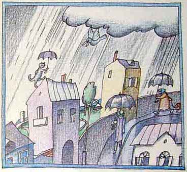 Смотрите, как он отчаянно машет тросточкой и старается увернуться от каждой капли дождя. Но подождите над ним смеяться. Когда вы узнаете, что маленький прохожий сделан из картона, а одежда его сделана из бумаги, вы поймёте, почему он боится дождя.