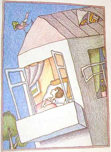 Здесь он посидел и прислушался. Дверь в комнату приоткрыта. Неслышным шагом Проказник вошёл комнату и сел кувшинчиком у постели.