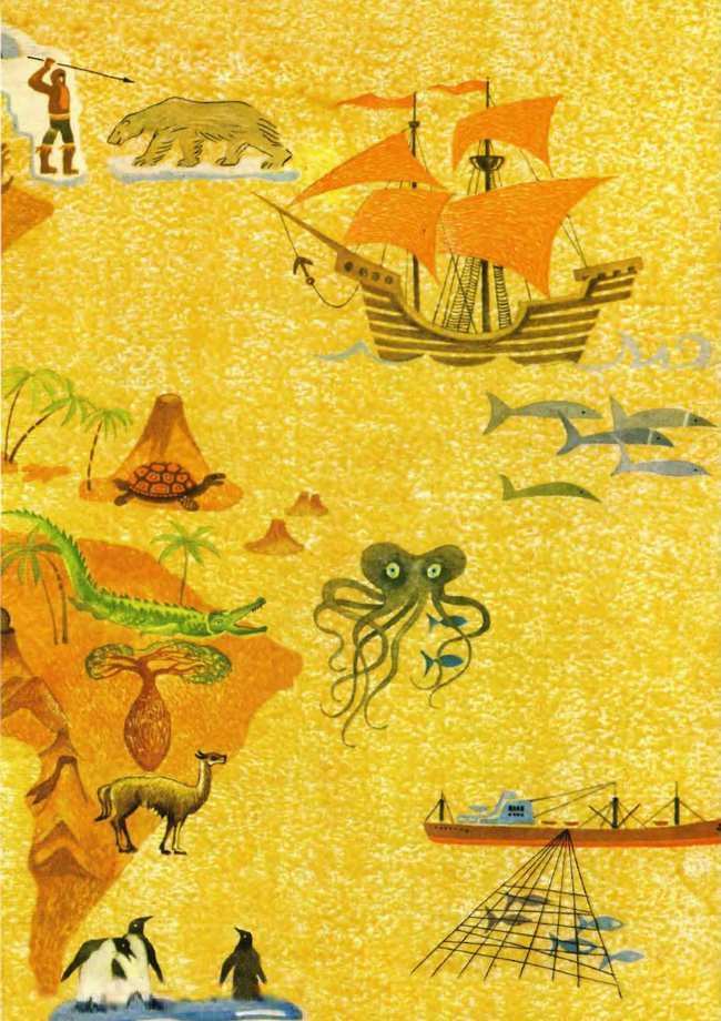 61. Оказывается, вовсе не все животные боятся змей. Отчаяннее всех преследуют змей маленькие, покрытые густым мехом хищники — мангусты, которые живут в южных странах, длинноногие африканские птицы — марабу и наши колючие ночные охотники — ежи. Некоторые орлы тоже нападают на змей… Английский писатель Редьярд Киплинг написал об индийской мангусте очень интересный рассказ. Называется «Рики-Тики-Тави». 62. Когда мореплаватели впервые увидали пингвинов, они издали приняли этих птиц за людей в меховых одеждах. Летать пингвины не могут — их крылья похожи на ласты. Вот почему они великолепно плавают. Пингвины могут жить на берегах Антарктиды, где нет никакой растительности, потому что пищу им доставляет океан, в котором они ловят рыбу. Своих птенцов пингвины выводят на льду. Делают они это так. Самка сносит яйцо, только не на лёд, а себе на ноги. И тут же передаёт его самцу — тоже на ноги. Сверху яйцо накрывается большой складкой кожи, свисающей с живота и покрытой пушистыми, как мех, пёрышками. Так и ходит пингвин с яйцом на ногах, выгревая его, пока не вылупится птенец. 63. Женщины любят шубы из опоссума. Они очень модные. А кто такой опоссум? Животное, вроде огромной пушистой крысы. Живёт в лесах Северной и Центральной Америки… Мы на нём погорели — никто не знал, что оно сумчатое. Думали, что сумчатые животные есть только в Австралии. А оказывается, опоссум тоже, когда рождает детёнышей, кладёт их в сумку на своём животе и там выкармливает. 64. ЗАДАЧА: Два полярных исследователя, назовём их А и Б, вернулись в Москву. Оба привезли фотографии тех птиц и зверей, которых они видели. Исследователь А снял китов, тюленей, морских слонов, чаек, пингвинов… Исследователь Б тоже привёз фотографии китов, тюленей и чаек. Пингвинов и морских слонов не встречал. Зато у него были снимки моржей, белых медведей и песцов. Теперь ответьте, какой исследователь был в Арктике, а какой в Антарктиде?