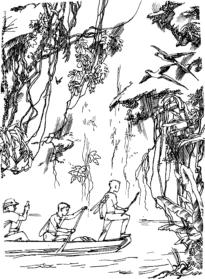 Лодка плыла вниз по извилистой быстрой реке. На берегах реки росли гигантские тропические деревья. Их опутанные лианами кроны смыкались вверху, образуя сплошной зелёный навес. Под ним царили влажные сумерки. Тонкие стрелы пробивающихся сквозь листву отвесных солнечных лучей то здесь, то там пронизывали таинственную полутьму. Запах сырой земли и гниющих листьев смешивался с запахами реки. Было душно и жарко. Лианы свисали над нами, как оборванные канаты. Некоторые из них были неподвижны, другие чуть покачивались из стороны в сторону или внезапно вздрагивали, словно живые существа, когда прикасались концами к поверхности воды. Огромные, ярко-окрашенные бабочки и прозрачнокрылые, как будто сделанные из целлофана стрекозы, пьяно летавшие над рекой, иногда садились на стебли лиан и замирали на них, похожие на фантастические живые цветы… С подмытых течением берегов в воду сползали обнажённые корни деревьев. Они были толстые, мокрые и кривые. Обтекая их, вода журчала и закручивалась в воронки. А в глубине реки смутно струились вытянутые по течению длинные пряди зеленовато-бурых водорослей… Вокруг лодки кружились осы, жуки и мухи. Воздух был насыщен их назойливым однообразным гудом. Свиристели не видимые в траве цикады. А сверху, из густоты ветвей, доносился несмолкаемый гортанно-звонкий крик попугаев… …От этого крика у нас непрерывно звенело в ушах… Мы возвращались в лагерь. Профессор Академиков и Каген гребли. Я стоял на носу лодки и отводил палкой концы лиан, когда они оказывались на нашем пути.