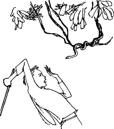 Место там было подходящее — один из лесных великанов рухнул от старости, и над рекой образовался просвет, сквозь который прорывался сноп солнечных лучей, привлекая множество великолепных насекомых. Академиков разрешил Нкале немного полетать за ними. Она немедленно вооружилась сачком и начала охоту. Не опасаясь дурных последствий, мы спокойно ушли вперёд. Сеггридж и Рам Чаран были опытные путешественники, не впервые проникавшие в дебри экваториального леса. Их лодка должна была догнать нас, как только Нкале угомонит немного свой охотничий пыл. По нашим расчётам сорока́ минут было вполне достаточно. Однако лодка не появлялась. Академиков начал тревожиться. — Может быть, мы плывём слишком быстро? — предположил он. — Перестань грести, Каген. Табань!.. Оба с силой навалились на вёсла, тормозя лодку. Лодка остановилась. Мы прислушались. Ни голосов наших спутников, ни плеска вёсел не было слышно. — Странно, — сказал Академиков. — Очень странно… Лодка медленно поворачивалась на месте. Я протянул палку, чтобы оттолкнуть оказавшуюся прямо перед моим носом лиану. Лиана откачнулась в сторону, на мгновенье, словно в раздумье, остановилась, а затем плавно пошла обратно. И вдруг я увидел, как на конце лианы поднялась плоская треугольная голова серо-зелёного цвета, с круглыми немигающими глазами и трепещущим в воздухе тонким раздвоенным языком. С тихим шипением она тянулась прямо к моему лицу… «Змея!» — хотел закричать я, но отвратительный страх сдавил мне горло. Всё тело мгновенно покрылось холодным потом…